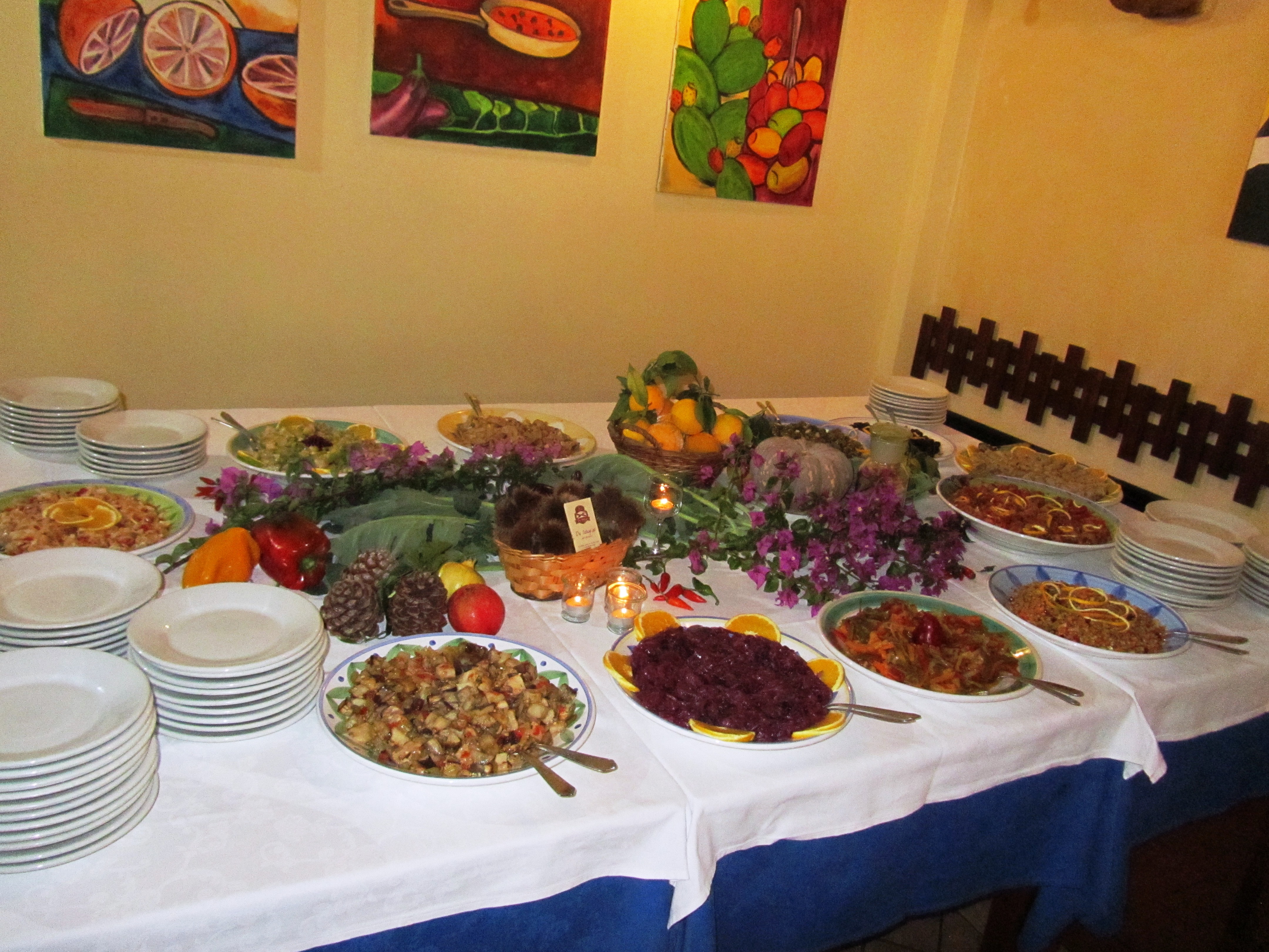 La Delegazione di Messina si è ritrovata al ristorante “Pellegrino” a Santa Lucia del Mela, assegnatario del Diploma di Buona Cucina 1987, per una affollatissima riunione conviviale (foto 1). Unanime l’apprezzamento per un menu di tradizione fondato su antipasti preparati con primizie dell’orto (foto 4) e su prelibate e innovative preparazioni di paste e carni. Foto 2. Accademici e ospiti a tavola. Foto 3. Il Delegato Francesco Trimarchi consegna a Santo e Federica Pellegrino il piatto dell'Accademia con (da sinistra) il Consultore Tommaso Faranda, il Delegato onorario Antonio Barresi, Santo e Federica, il Consultore e Simposiarca della riunione Attilio Borda Bossana (membro CST), il Segretario Giovanni Rossi e il Consultore Salvatore Ragusa.