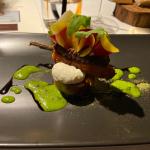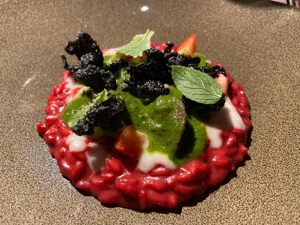 È avvenuta il 14 novembre scorso la consegna del Diploma di Cucina Eccellente al ristorante "Spinechile Resort" di Schio (VI). Foto 1. Il Delegato Renzo Rizzi al centro con le brigate di cucina e sala, consegna il Diploma di Cucina Eccellente a Corrado Fasolato. Alla sua sinistra la signora Paola Fasolato e il Simposiarca della serata Massimo Carboniero. Foto 2-4. Dal menu: Il coniglio e la carota (2); bigoli al torcio, pino, anguilla e tartufo nero del Tretto (3); risotto all'estratto di rapa rossa, lumache alla melissa, fragole e cren (4).