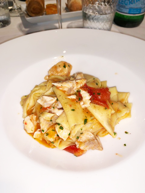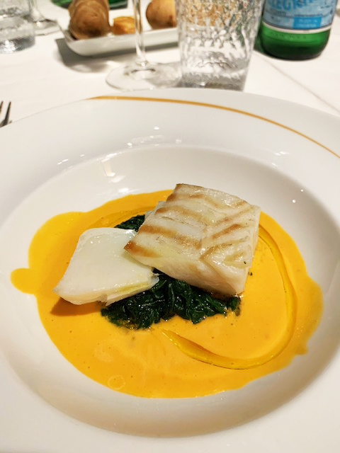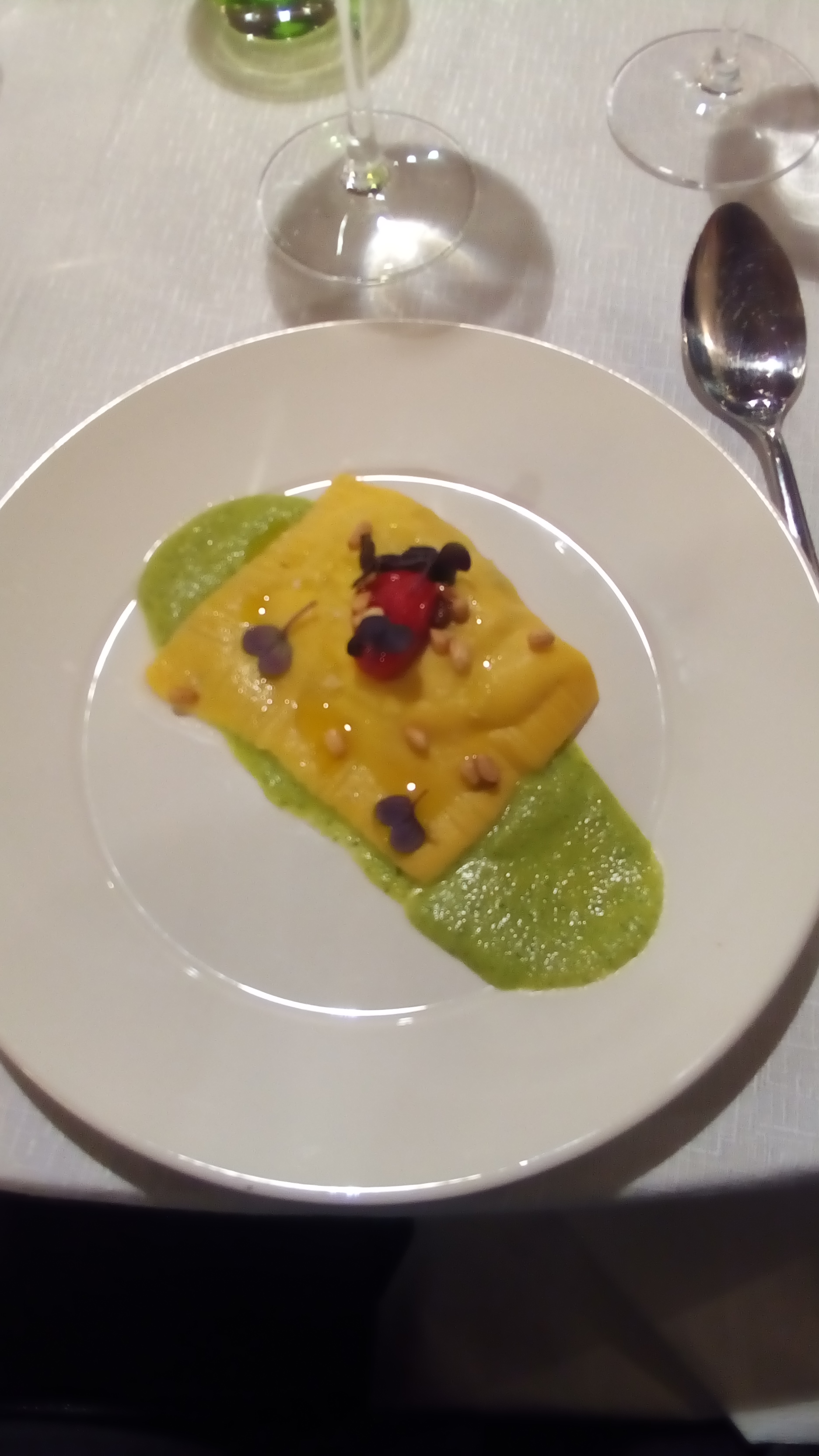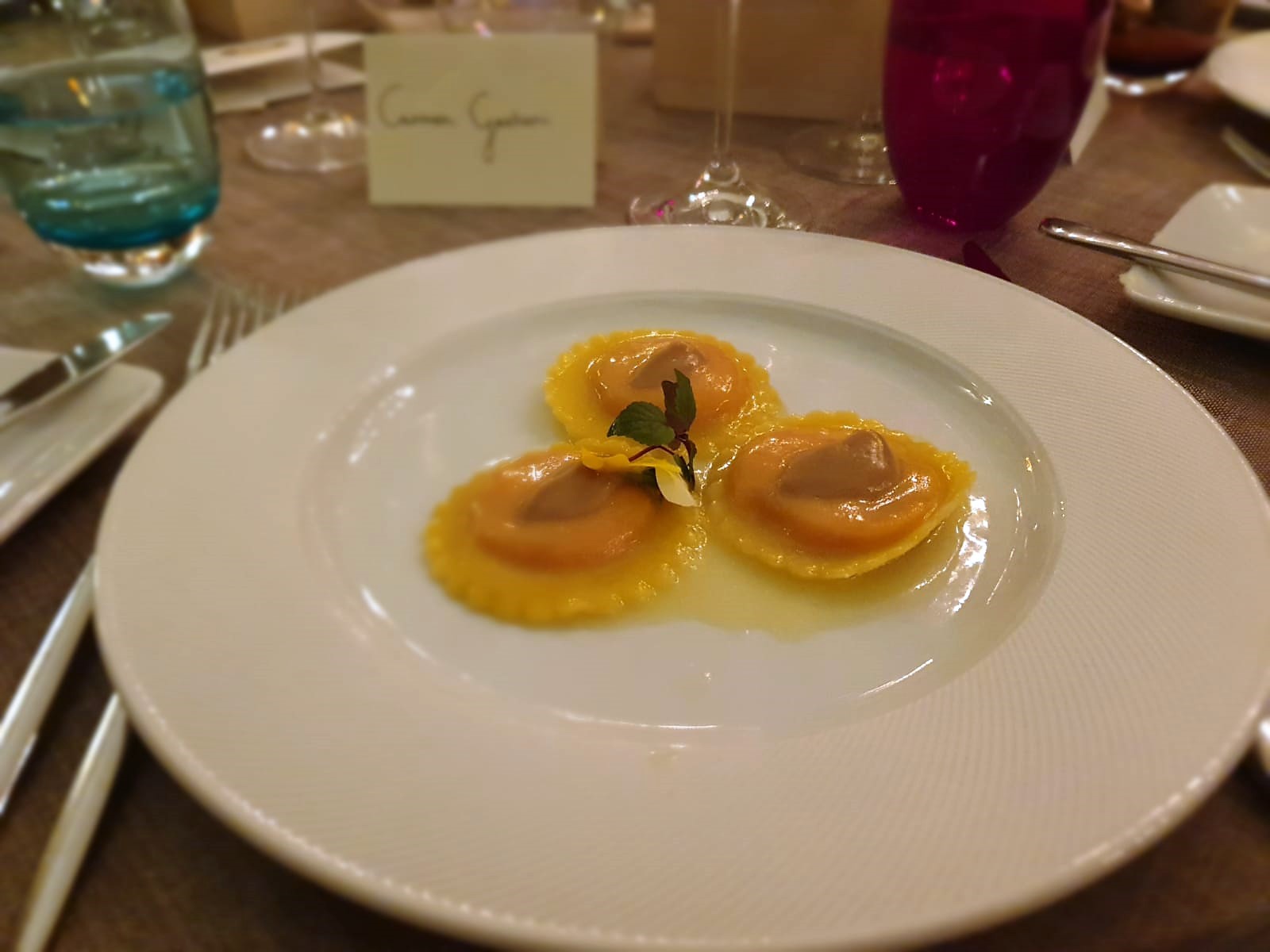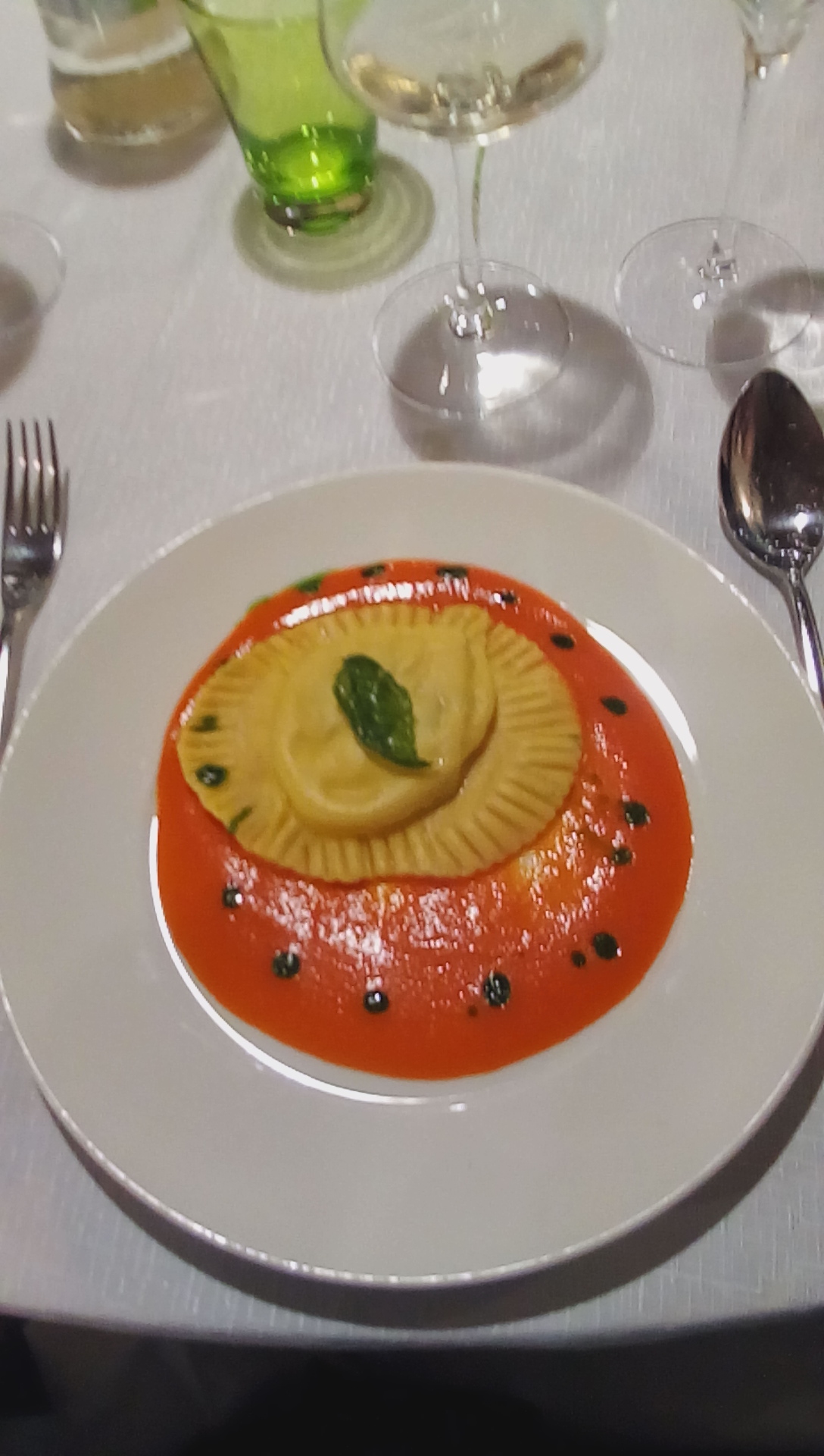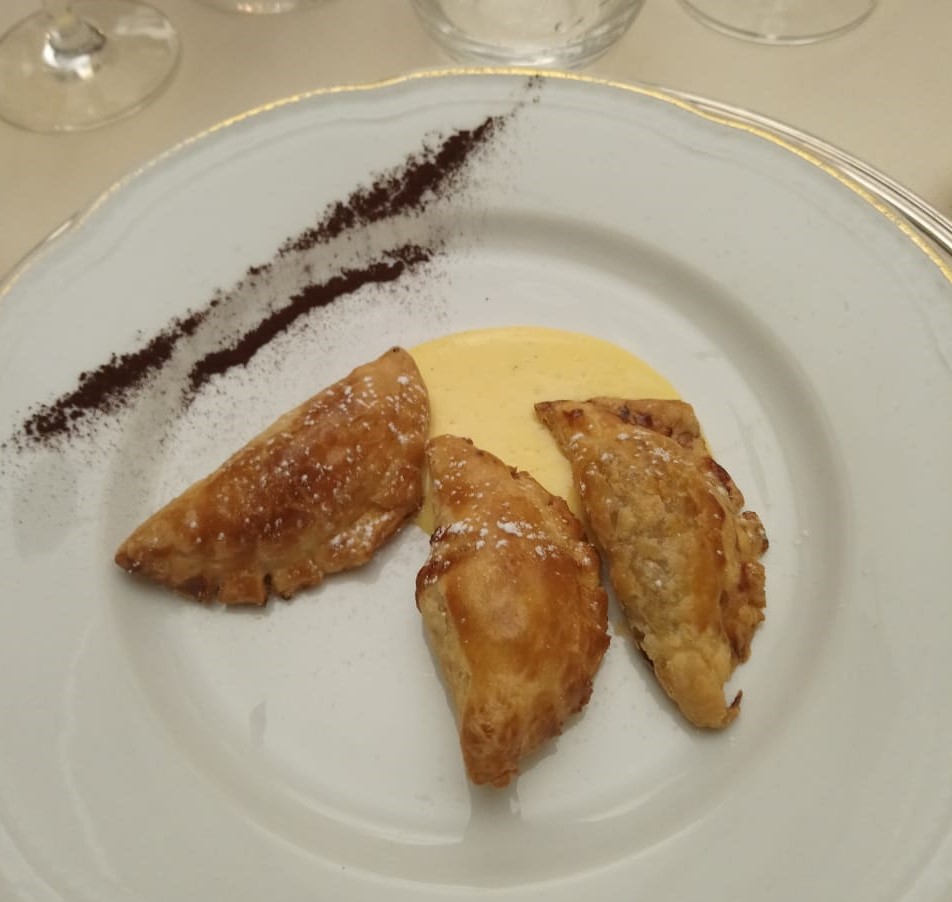 La Delegazione di Biella ha organizzato la cena ecumenica 2019 sul tema "La pasta fresca, ripiena e gli gnocchi nella cucina della tradizione regionale" al ristorante Croce Bianca di Oropa (Biella). Simposiarca della serata, Giorgio Lozia, membro del Centro Studi territoriale del Piemonte (nella foto 2). Foto 1. La Delegata Maria Luisa Bertotto, ospiti e Accademici a tavola. Foto 3.La Delegata e lo chef Ivan Ramella. Foto 4. Dal menu: ravioli di sfoglia ripieni di fichi.
