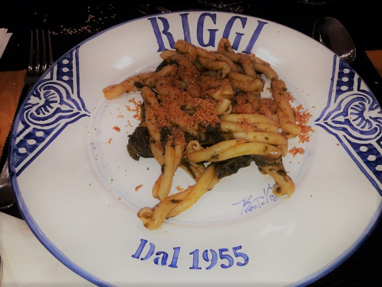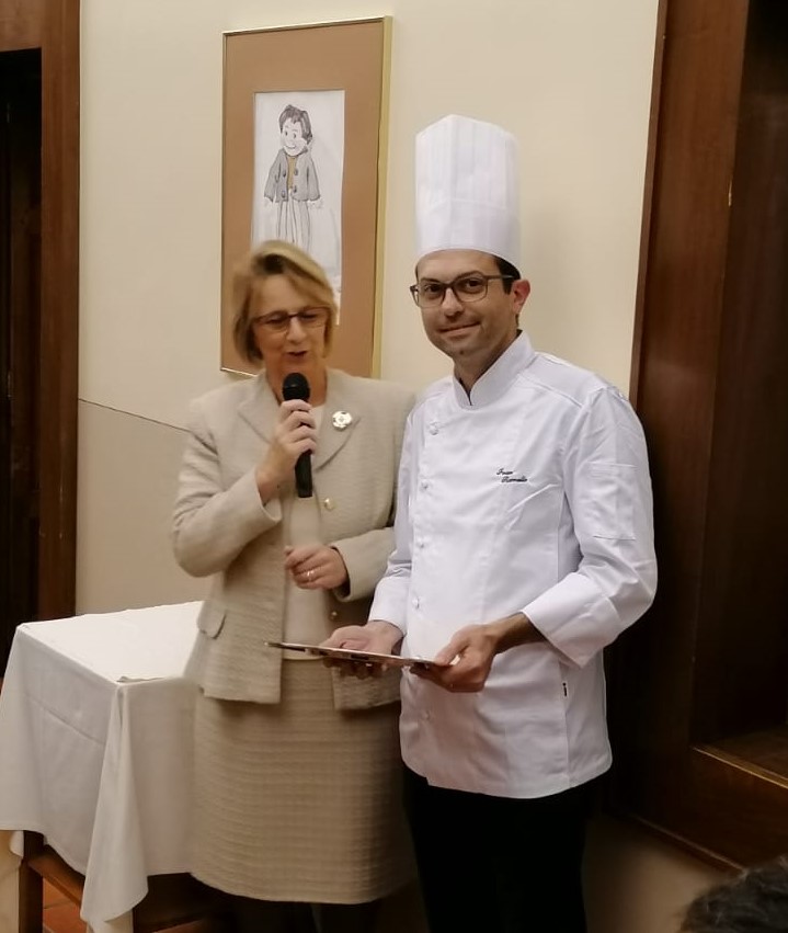 La Delegazione dell'Alto Vicentino ha organizzato la cena ecumenica 2019 sul tema "La pasta fresca, ripiena e gli gnocchi nella cucina della tradizione regionale" presso l’IPSSAR "Pellegrino Artusi" di Recoaro Terme (VI). In questa occasione il Delegato Renzo Rizzi ha consegnato il premio "Massimo Alberini" ai legali rappresentanti della gastronomia Lallo & Lolli di Valdagno (foto 1). Foto 2. Il Delegato al centro fra il Dirigente scolastico dell'IPSSAR di Recoaro (in piedi a sinistra) ed il relatore il cuoco A. Sandri (a destra seduto). Foto 2. Aperitivi: bigoli mori con la sardela. Foto 4. Gnocchi con la fioreta.