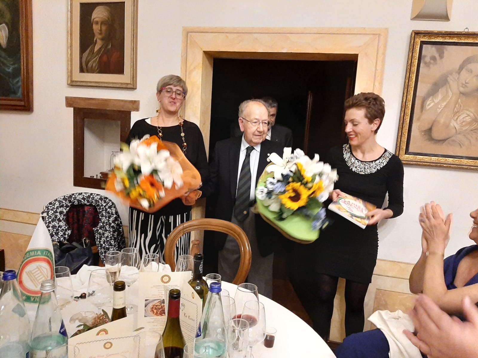 La Delegazione di Macerata ha organizzato la cena ecumenica 2019 sul tema "La pasta fresca, ripiena e gli gnocchi nella cucina della tradizione regionale" negli eleganti locali del ristorante “Le Case”. Per l'occasione è stata invitata, quale relatrice, la signora Laila Nonni, professionista della pasta, la cui famiglia da oltre 60 anni gestisce in città alcuni rinomati esercizi di pasta fresca. Foto 1. La consegna agli accademici del volume "La pasta fresca, ripiena e gli occhiali nella cucina della tradizione regionale". Foto 2. La relatrice Laila Nonni. Foto 3. Il Delegato Ugo Bellesi consegna un omaggio floreale alla relatrice e alla titolare del ristorante.