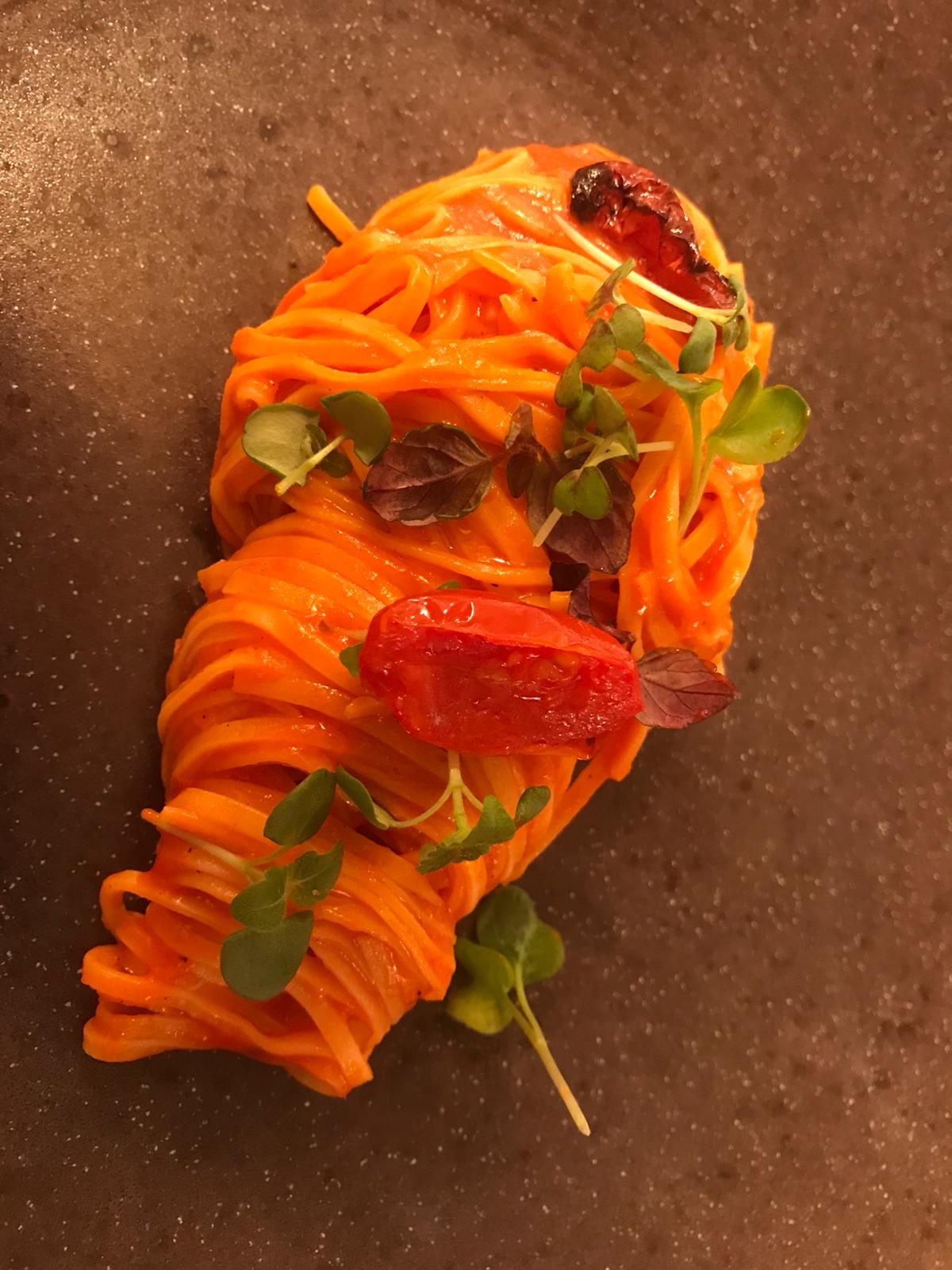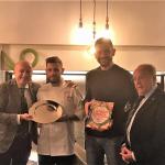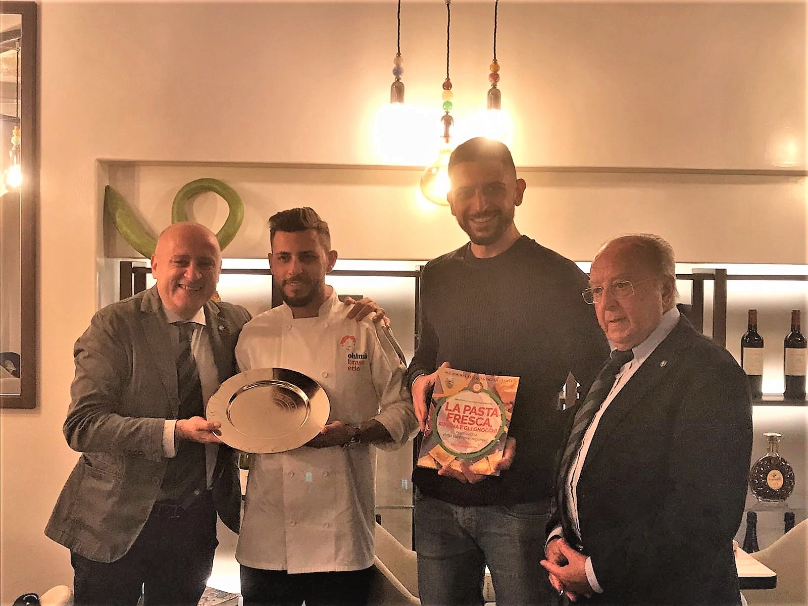 La Delegazione della Penisola Sorrentina ha organizzato la cena ecumenica 2019 sul tema "La pasta fresca, ripiena e gli gnocchi nella cucina della tradizione regionale" nel ristorante "Ohimà Brasserie" di Positano (SA). Foto 1. La consegna del piatto dell’Accademia al patron del ristorante Luigi Collina e allo Executive Chef Emanuele Mosca da parte del Delegato Giuseppe De Simone (primo a sinistra) e del Presidente del Centro Studi "Franco Marenghi" e Delegato onorario della Penisola Sorrentina Sergio Corbino (primo a destra). Foto 2. Tagliolini alla crema di pomodoro grigliati e lime. Foto 3. Tortello ripieno di coniglio, fonduta di parmigiano reggiano 36 mesi, guazzetto di cipolle e tartufo nero. Foto 4. Pasta soffiata al cacao, spuma di mascarpone e gelato al caffè.