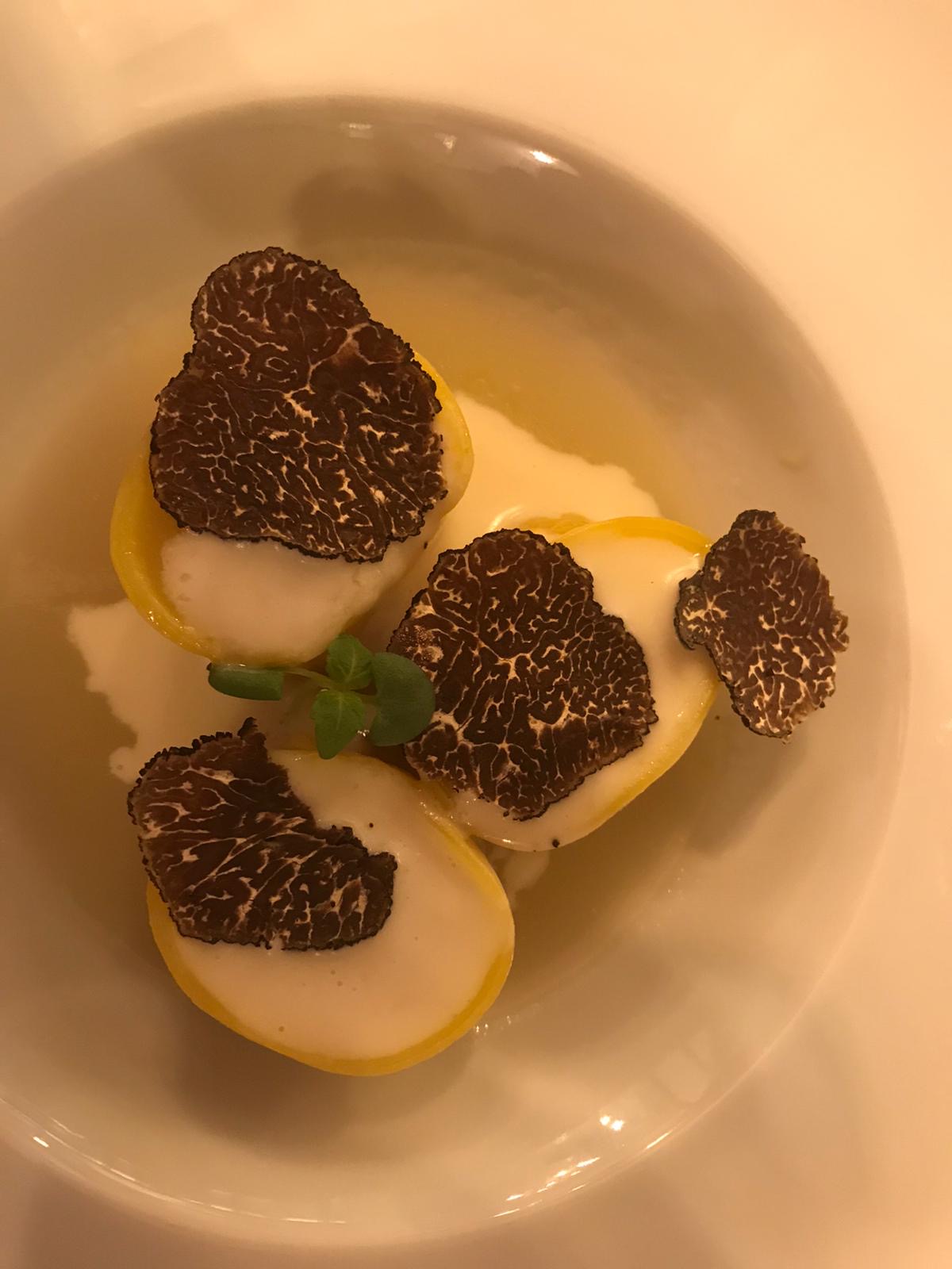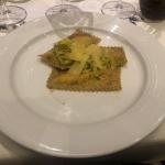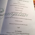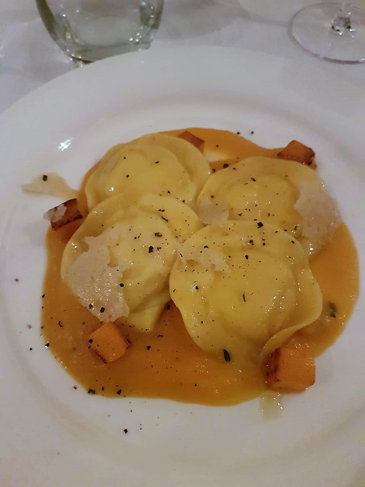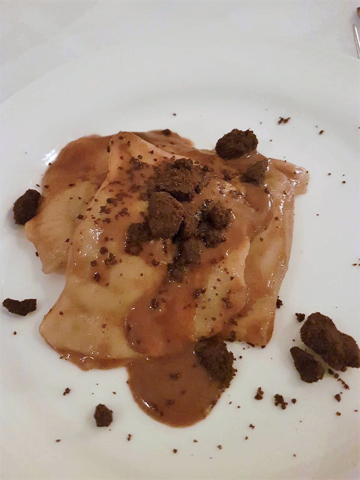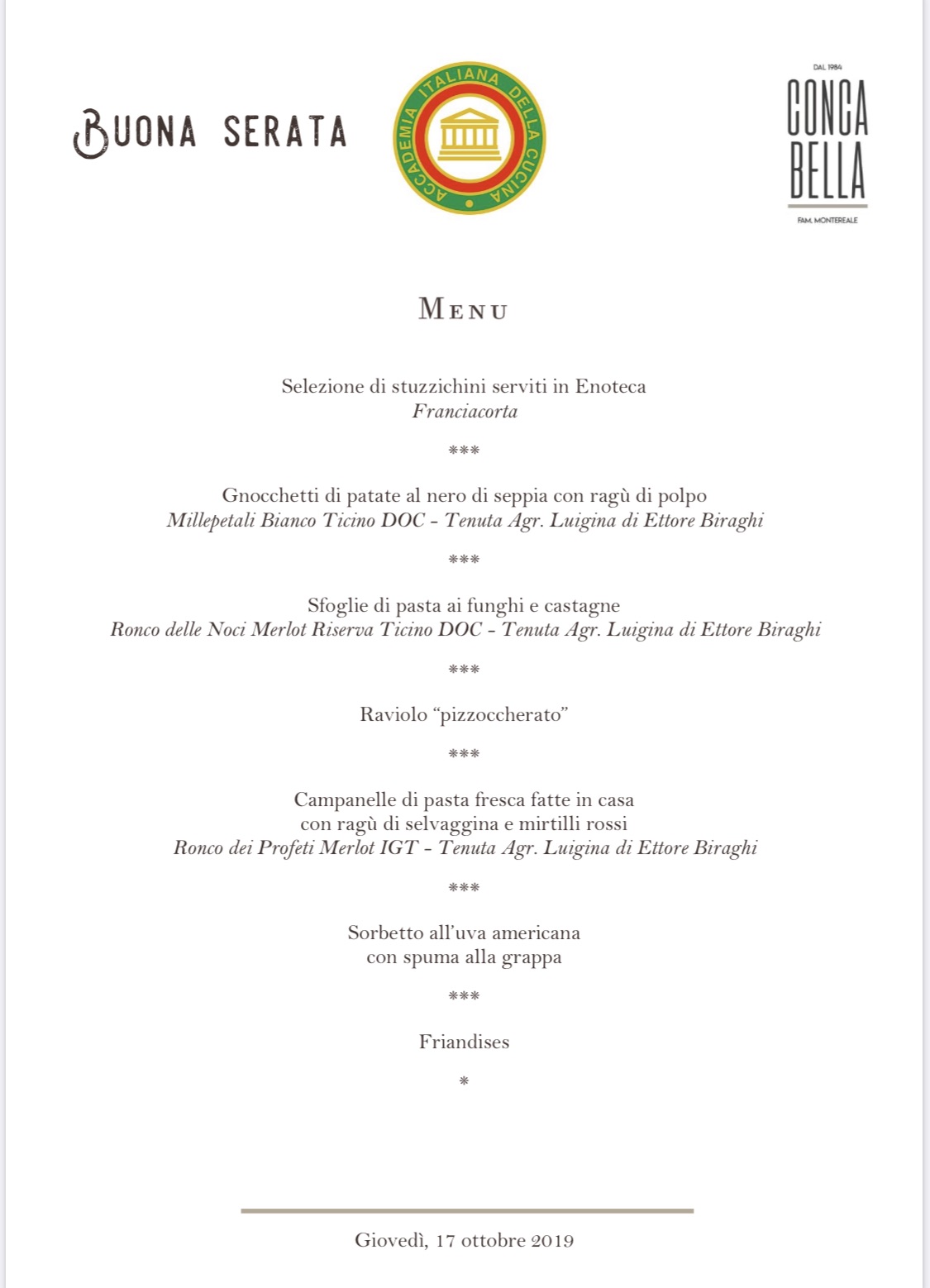 La Delegazione della Svizzera Italiana ha organizzato la cena ecumenica 2019 sul tema "La pasta fresca, ripiena e gli gnocchi nella cucina della tradizione regionale" presso il ristorante "Conca Bella" a Vacallo. I Simposiarchi Massimo Ciocco e Alessandro Del Bufalo insieme allo chef Giordano Bertolina hanno rispettato il tema della serata. Ospiti sono stati il sig. Paolo Serra e il sig. Ettore Biraghi. Foto 1 (da sinistra). Paolo Serra, i Simposiarchi Massimo Ciocco e Alessandro Del Bufalo, il Delegato Emilio Casati. Foto 2 (da sinistra). Ettore Biraghi, i Simposiarchi Massimo Ciocco e Alessandro Del Bufalo, il Delegato Emilio Casati. Foto 3. Il menu della serata. Foto 4. Raviolo pizzoccherato.