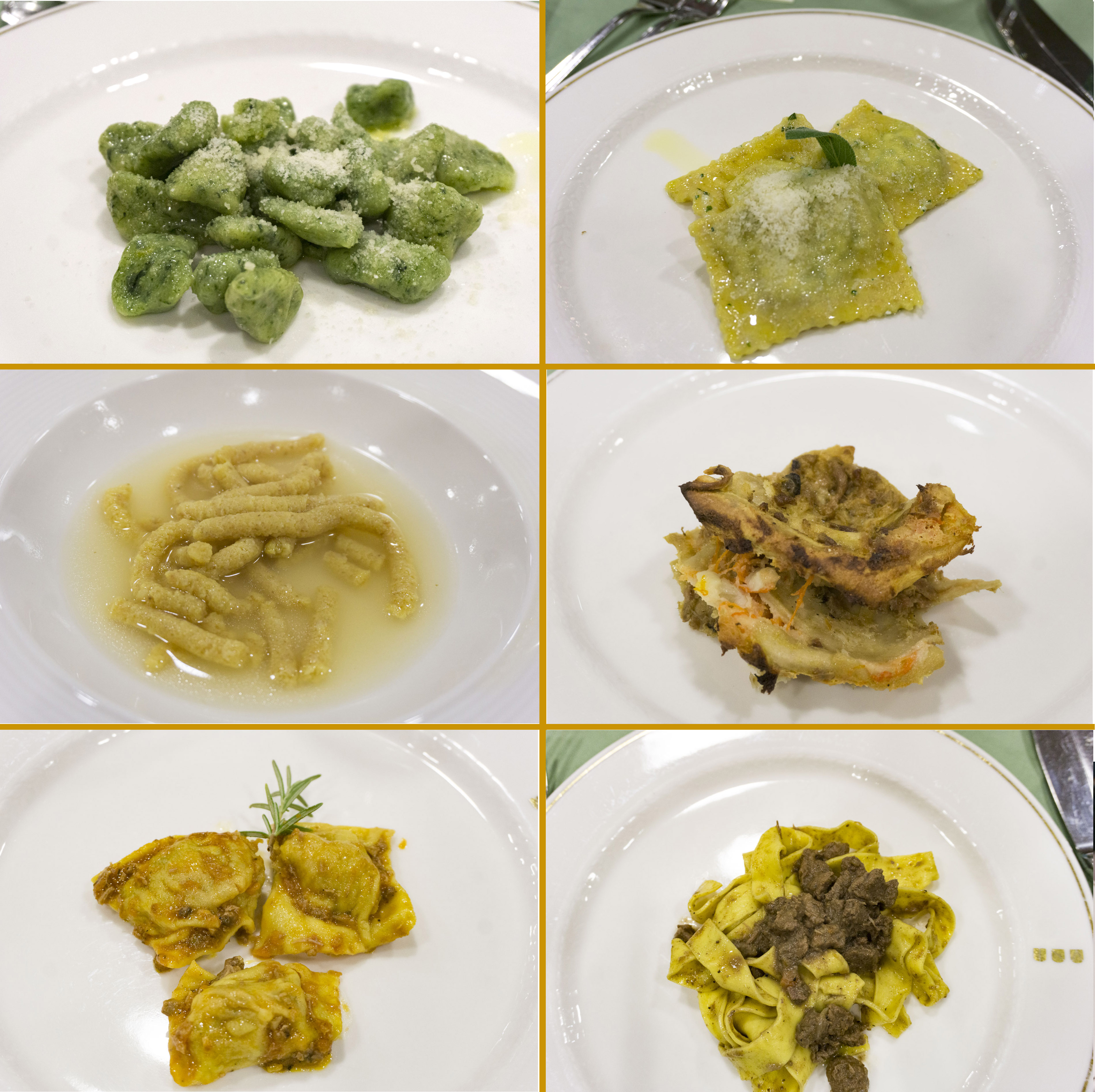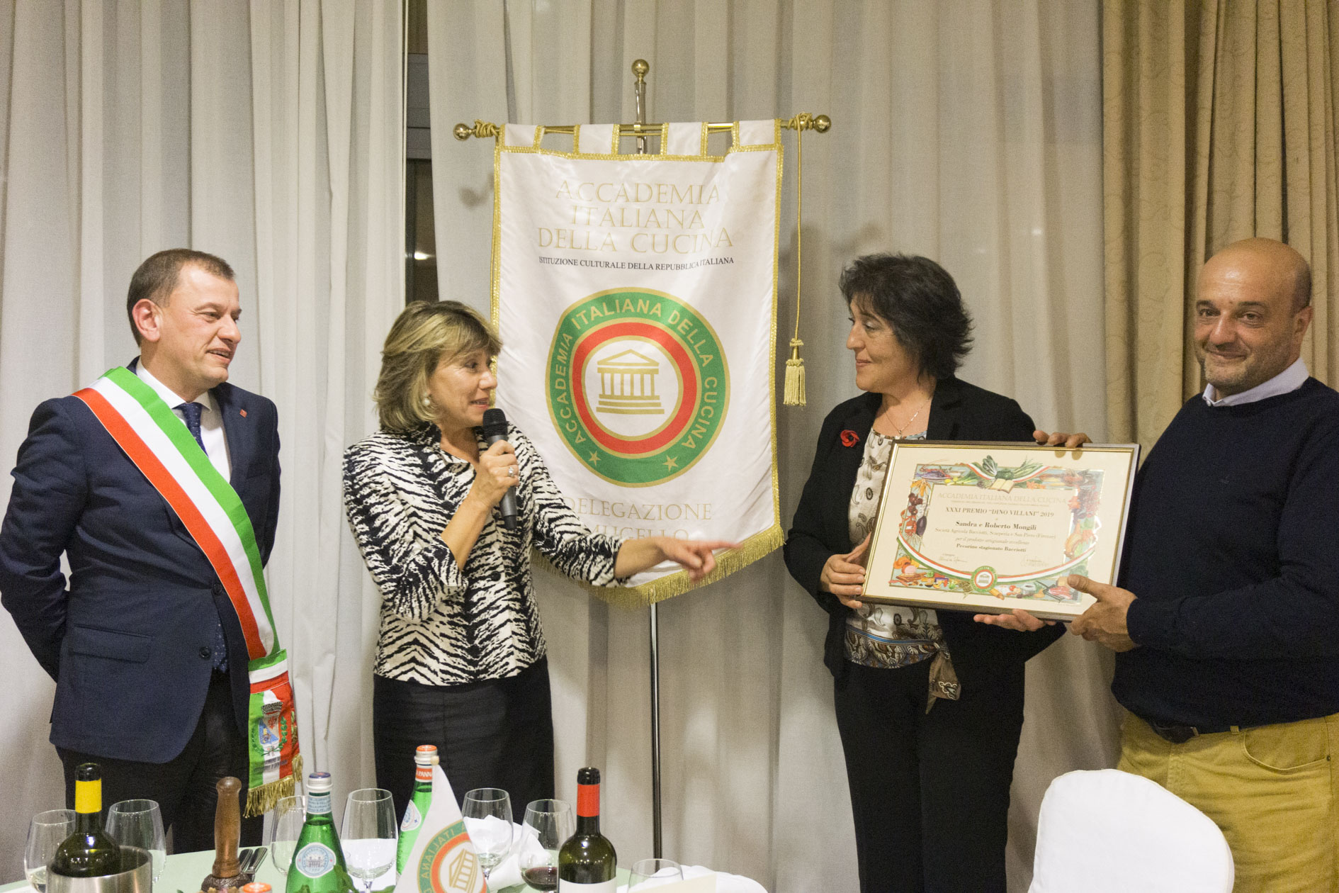 La Delegazione del Mugello ha organizzato la cena ecumenica 2019 presso il Golf Club "Poggio dei Medici" a Scarperia. Alla serata, svoltasi alla presenza di numerosi Accademici e ospiti tra cui il Sindaco di Scarperia e San Piero, Federico Ignesti e il Sindaco di Vicchio di Mugello Filippo Carlà Campa, sono stati invitati i cuochi di sei ristoranti del territorio ciascuno dei quali ha preparato un piatto della tradizione. In questa occasione è avvenuta la consegna del Premio "Dino Villani" a Sandra e Roberto Mongili dell'Azienda Bacciotti per la produzione del "Pecorino stagionato Bacciotti" (foto 1, la Delegata Sforzini e il Sindaco Ignesti consegnano il premio). Foto 2. I cuochi dei sei ristoranti insieme allo staff del Golf Club (in alto da sinistra Gabriele e Nicola Tranchina, Donato Petri, Elisabetta Fusi e Mirko Dello Iacono, Paola Giovannardi; in basso da sinistra Cristian Borchi, Mattia Cristian) la Delegata Monica Sforzini e i Simposiarchi Carla Gramigni Mazzocchi, Renzo Bartoloni e Mauro Santoni. Foto 3. Accademici e ospiti. Foto 4. Gnocchi all'olio e parmigiano; ravioli di ricotta e spinaci al burro e salvia; passatelli in brodo; lasagne di castagne, zucca e ragù di colombaccio; tortelli di patate sull'anatra; pappardelle al cinghiale.