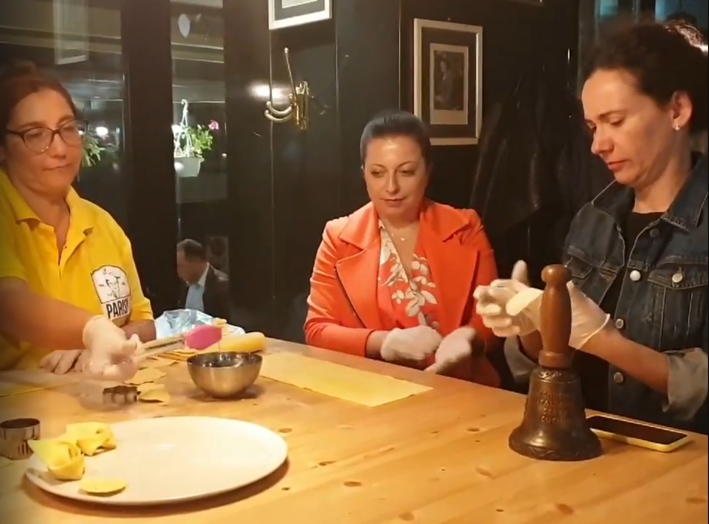 La Delegazione di Sofia ha organizzato la cena ecumenica 2019 sul tema "La pasta fresca, ripiena e gli gnocchi nella cucina della tradizione regionale" presso il ristorante “Il Teatro” di Michele Giorgi e Miglena Duhovnikova-Giorgi. La cena è stata preceduta da una interessante dimostrazione di pasta ripiena di Maria Angela Parisi (foto 1) la cui famiglia produce pasta fresca da 25 anni. Foto 2 (da sinistra). Ufficiale di Collegamento del Ministero dell’Interno italiano per la Bulgaria e la Georgia presso l’Ambasciata d’Italia a Sofia, dott.ssa Giovanna Pasqualone, Inter Nations Ambasador a Sofia, dott. Carlos Arellano, la Delegata Penka Nesheva. Foto 3. Gli ospiti prepararano la pasta ripiena. Foto 4. La consegna del piatto dell'Accademia ai ristoratori.