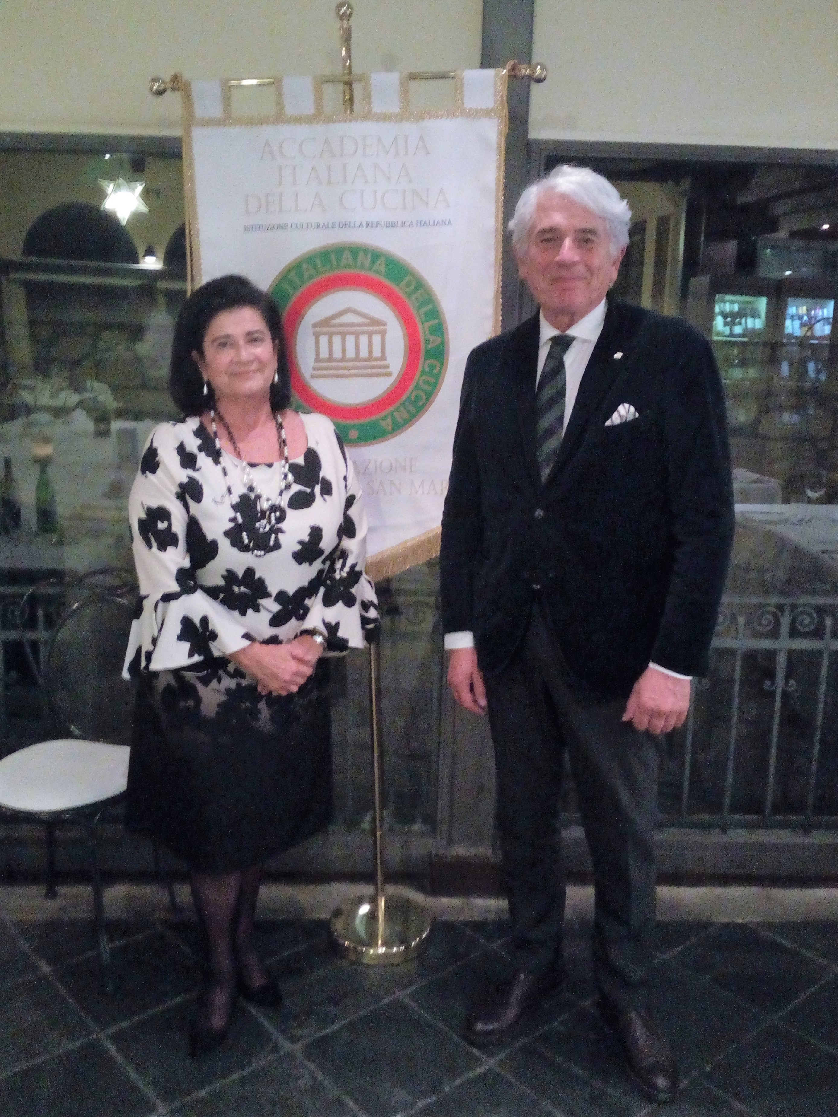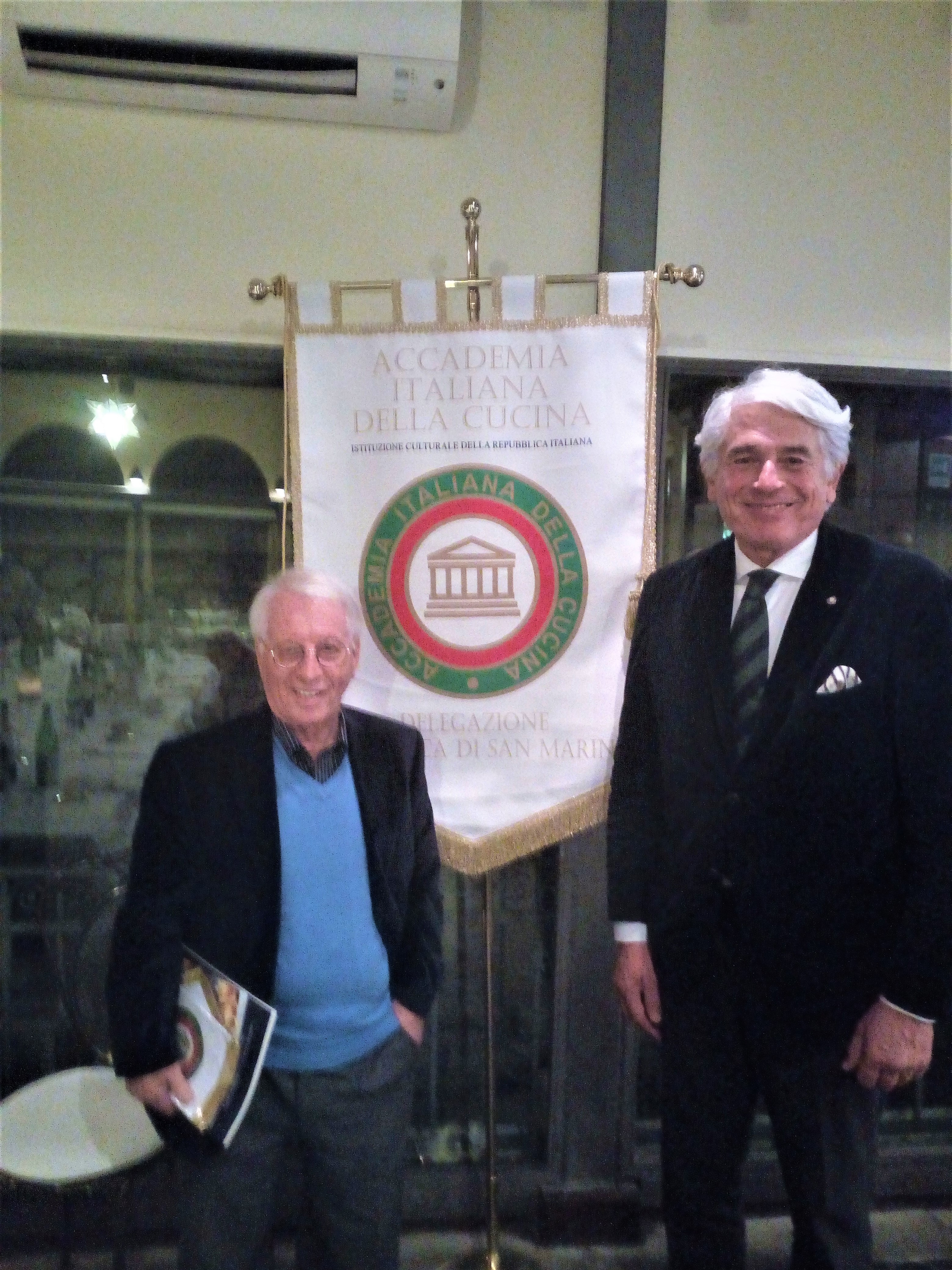 La Delegazione di San Marino ha organizzato la cena ecumenica 2019 sul tema "La pasta fresca, ripiena e gli gnocchi nella cucina della tradizione regionale" al Ristorante La Terrazza con un menu che ha unito tradizione e innovazione molto apprezzato dagli Accademici e ospiti. Gradito relatore della serata il Prof. Piero Meldini che ha illustrato la “ Storia della pasta ripiena in Romagna”. Nell’occasione è stato distribuito il sesto volume della collana Biblioteca di Cultura Gastronomica. Foto 1. Consultore-Segretario Elisabetta Righi Iwanejko e Delegato Andrea Negri. Foto 2. Prof. Piero Meldini e Delegato Andrea Negri. Foto 3. Il Delegato consegna le insegne accademiche al nuovo Accademico Mauro Maiani. Foto 4. Caramella di ricotta e coniglio saltato con burro di bufala, papavero e fossa.
