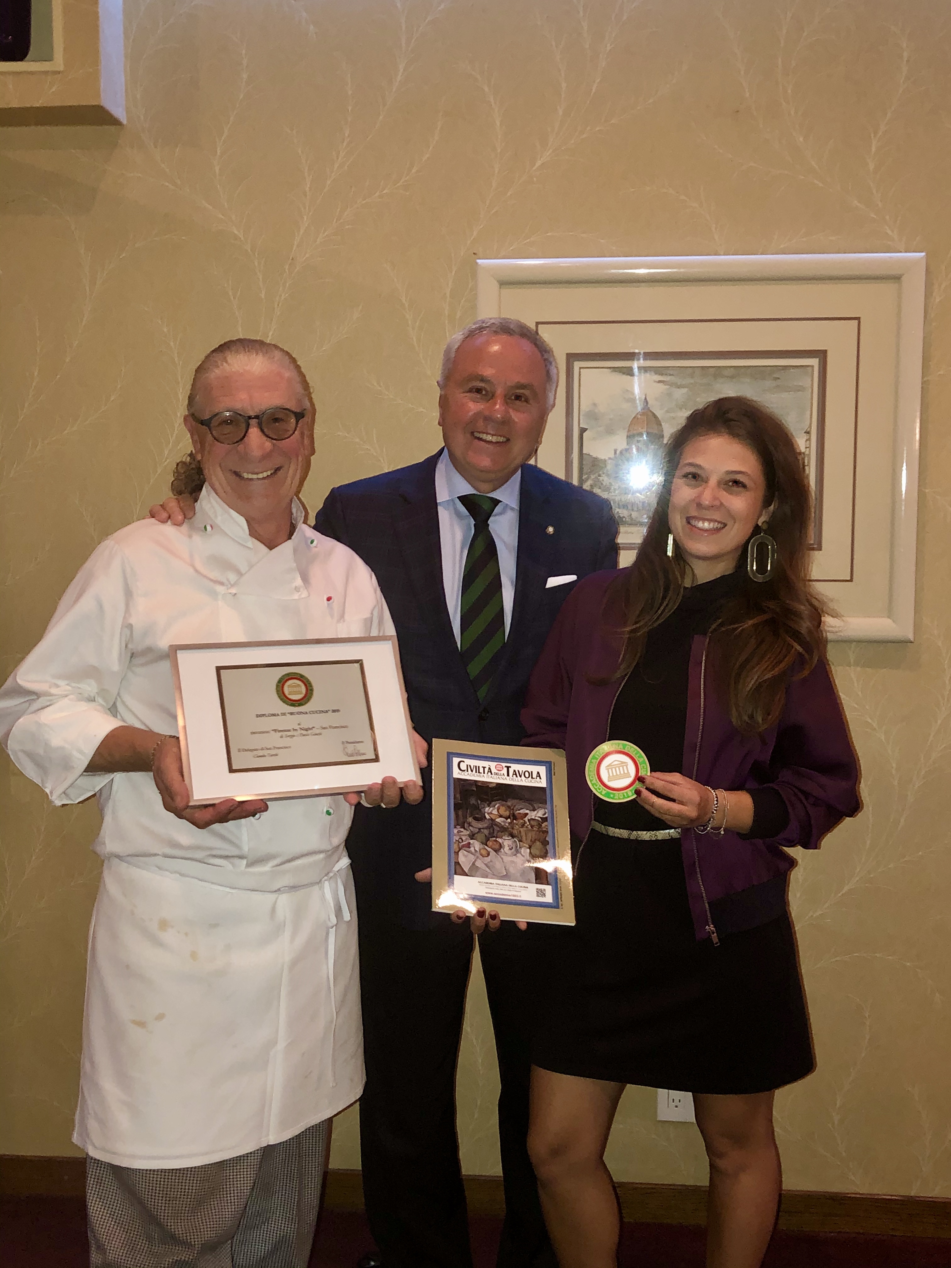 La Delegazione di San Francisco ha organizzato la cena ecumenica 2019 sul tema "La pasta fresca, ripiena e gli gnocchi nella cucina della tradizione regionale" presso il ristorante “Firenze by Night”. In questa occasione il Delegato Claudio Tarchi ha consegnato il Diploma di Buona Cucina (2019) a Sergio Giusti, proprietario e chef del ristorante (in foto 1 con la figlia Nadia e il Delegato Tarchi). Foto 2. Lo chef Sergio Giusti presenta agli Accademici il “Trittico di Gnocchi”.