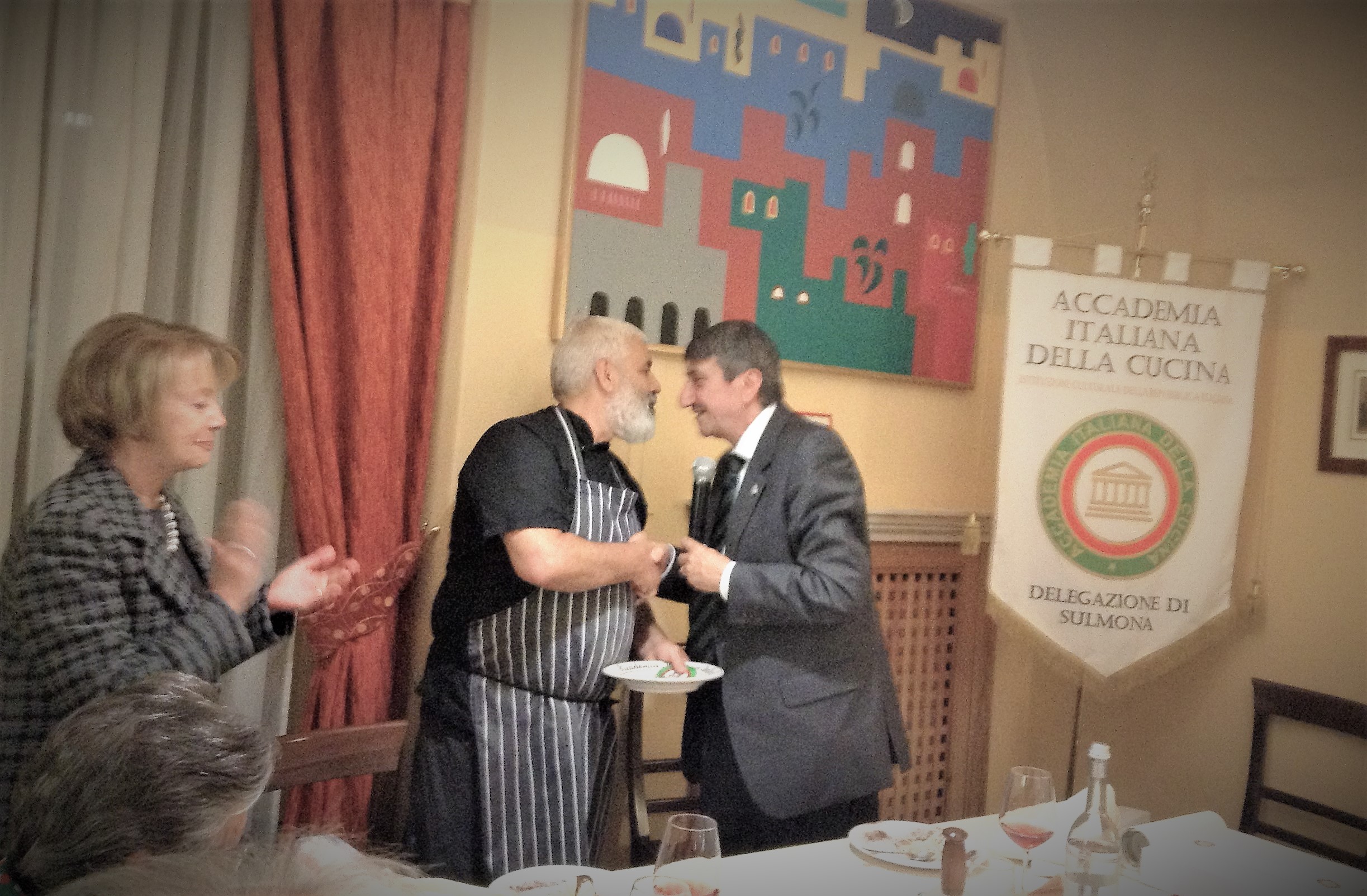 La Delegazione di Sulmona ha organizzato la cena ecumenica 2019 sul tema "La pasta fresca, ripiena e gli gnocchi nella cucina della tradizione regionale" presso il "Ristorante Clemente". La cena è stata preceduta da una vera e propria lezione dedicata alla pasta fresca tenuta dalla cuoca Isabella Cianferra in collaborazione con il Delegato Gianni D’Amario (foto 1). Foto 2. L'Accademico Gianni Febbo parla del tema della serata. Foto 3. Presentazione di due nuove Accademiche: da sinistra, la neo Accademica Mara Tritapepe, la Vice Delegata Carmela Petrucci, il Delegato Gianni D’Amario, la neo Accademica Alessia Caruso. Foto 4. Il Delegato consegna al cuoco Clemente il piatto dell'anno.