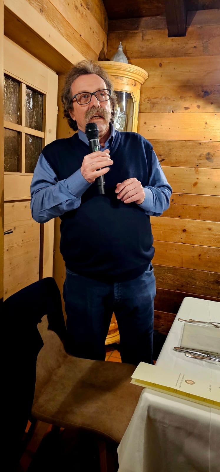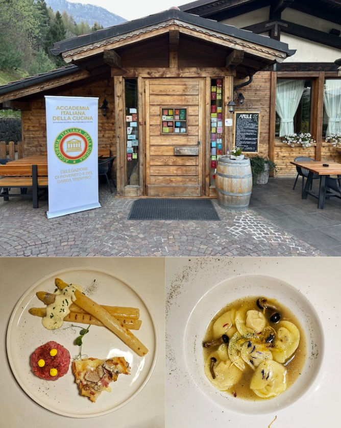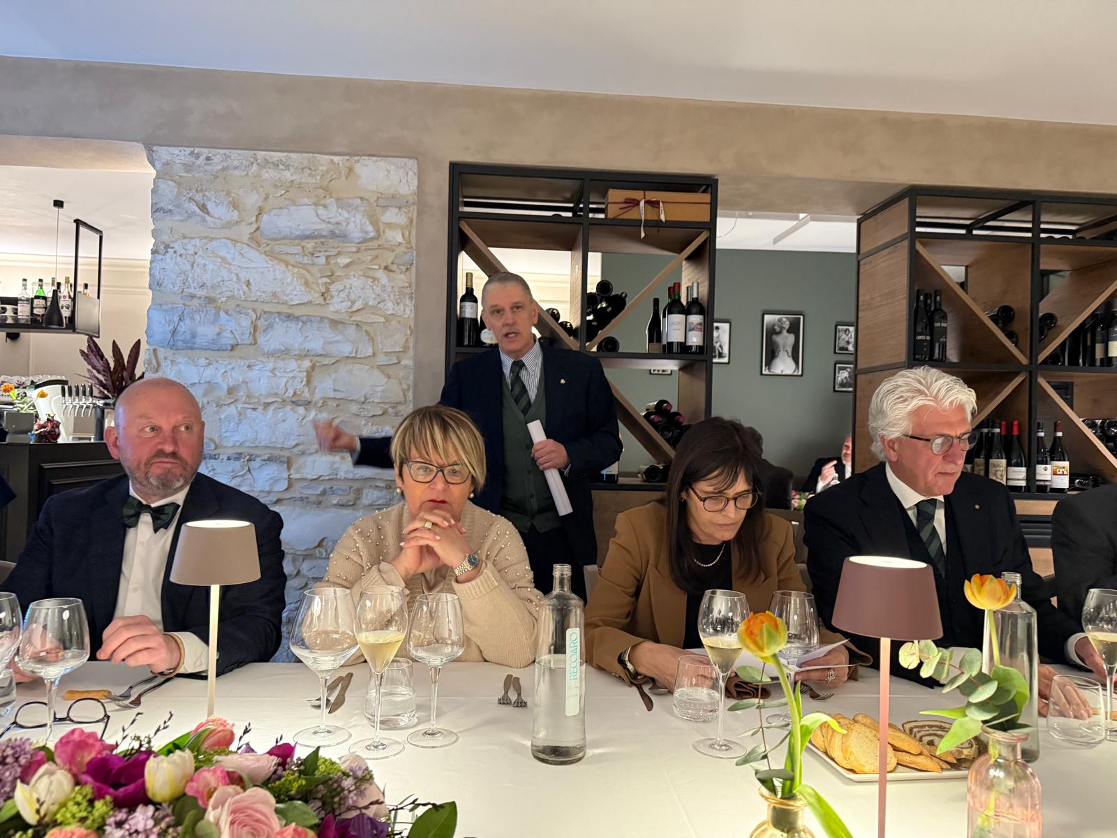 Bella e partecipata la conviviale pasquale della Delegazione di Rovereto e del Garda Trentino, svoltasi presso il caratteristico ristorante di montagna “Maso Palù” a Brentonico (TN), immerso nella calda atmosfera del Parco del Monte Baldo, il “Giardino d’Italia”. L’evento, curato dai Simposiarchi Donatella Mattana e Rosario Barcelli (foto 1), ha proposto un menù ispirato al territorio e alla sua ricca vegetazione. Tra gli ospiti, il Sindaco di Brentonico Dante Dossi, il Parroco don Daniele Laghi e il Presidente della Comunità della Vallagarina Stefano Bisoffi (foto 2). Molto apprezzata la relazione di Mario Pojer (foto 3), dell’Azienda Agricola Pojer e Sandri di Faedo, sui vini di montagna, alcuni dei quali in degustazione durante la cena. Grande successo per i piatti preparati da Emiliana Amadori, che ha saputo esaltare i sapori locali: in particolare la battuta di giovane manzo delle Giudicarie con maionese allo zafferano, il crostone con casolet, luganega, porcini e asparagi bianchi, e i tortellini alcappone in brodo di bosco e funghi chiodini (foto 4). Durante la serata è stato ricordato il fondamentale contributo del sig. Augusto Girardelli, che nel dopoguerra ha piantato oltre 280.000 alberi – soprattutto cirmoli – contribuendo al rimboschimento della zona. In suo onore, il dessert: un delicato gelato al Cirmolo.