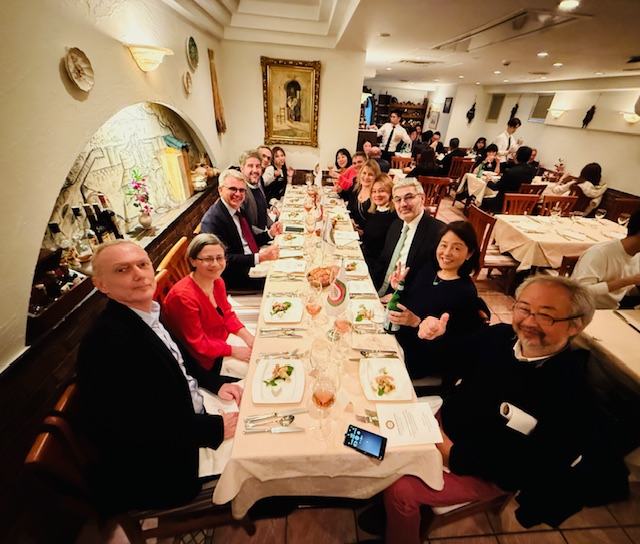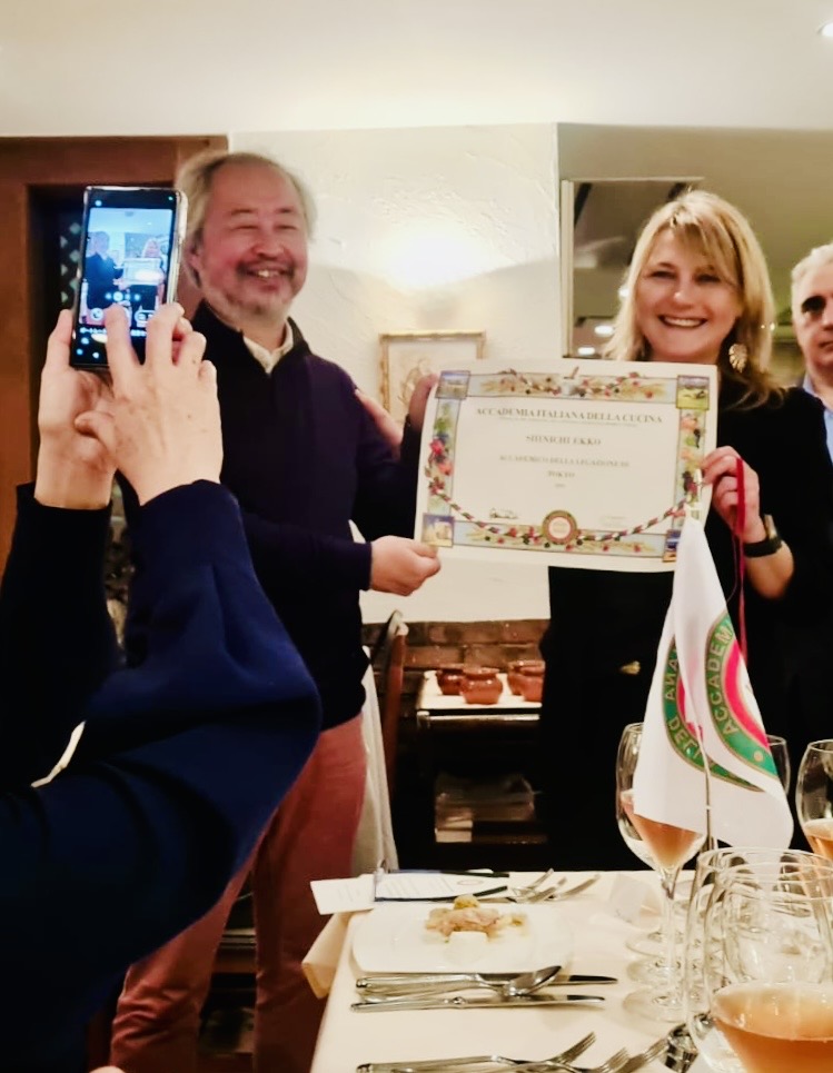 Un piacevole ritorno quello della Delegazione di Tokyo da Elio Locanda Italiana. Il locale ha immediatamente sorpreso gli Accademici con una vivacità inaspettata per un lunedì sera, senza interferire però con la gradevolezza della serata e l’atmosfera conviviale della bella tavolata. Il tema del menù proposto dallo chef Germano Orsara e dal suo team era la sostenibilità. Il patron Elio Orsara ha investito molto in vari progetti che ruotano proprio intorno alla sostenibilità. Questo ha dato l’opportunità non solo di gustare deliziosi piatti preparati con ingredienti sostenibili, ma anche di parlare di imprenditoria sostenibile, che trova soluzioni utilizzando risorse a impatto zero, se non positivo, sulla vita del pianeta e delle persone, che integra nei suoi processi etica e responsabilità e che porta con sé un concetto di profitto giusto ed equo. Alla serata erano presenti l’Accademica Onoraria Sabina D’Antonio e S.E. l’Ambasciatore Gianluigi Benedetti, ai quali va il ringraziamento e l’apprezzamento della Delegazione per la partecipazione garbata e allegra a una serata esuberante che ha pienamente celebrato lo spirito conviviale. Hanno vinto nei giudizi il tagliolino al cedro, il tagliere di formaggi accompagnato dalle confetture di Elio Farm e la premura del personale. Infine, ma non meno importante, è stato accolto con le insegne accademiche il nuovo Accademico Shinichi Ekko.