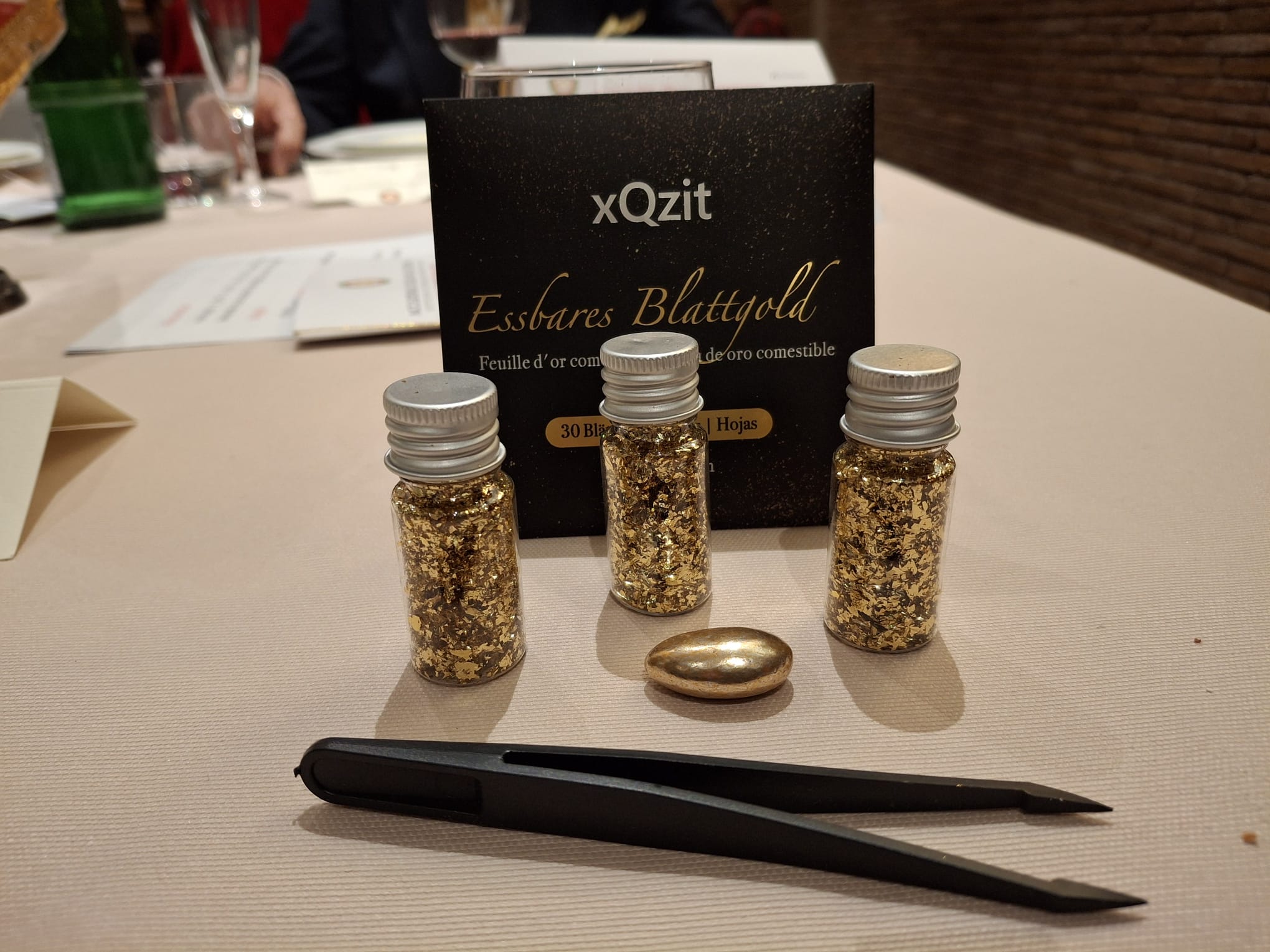 La Delegazione di Roma Eur ha inteso dedicare una riunione conviviale all’oro edibile. A parlare dell’utilizzo in cucina del più prezioso tra i metalli, Giovanni Pallotta, valente orafo, creatore di gioielli e perito del Tribunale di Roma, il quale ha brillantemente intrattenuto un pubblico numeroso e interessato di Accademici e loro ospiti, raccontando la storia e le caratteristiche di questa pratica, che risale ai tempi degli Egizi, da sempre simbolo di lusso e ricchezza e, in quanto tale, di differenziazione sociale nel confezionamento e nella presentazione dei piatti dall’antica Roma ai giorni nostri. L’oro in tavola ovviamente non ha odore né sapore e non è assimilabile in alcun modo dal nostro organismo; tuttavia, questo luccicante metallo ha il magico potere di appagare la vista e di stimolare l’apprezzamento delle pietanze decorate con le sue sfoglie, i suoi granuli o la sua polvere poiché è noto come, molto spesso, si mangi anche con gli occhi. La Simposiarca Tiziana Martino Marconi de Carles, validamente supportata dalla proprietà e dagli chef del ristorante Consolini, ha realizzato per l’occasione un menu composto di piatti assolutamente originali, che valorizzassero e dessero risalto all’impiego dell’oro alimentare ma che non fossero semplici riproposizioni di ricette rese celebri da altri Maestri della cucina.