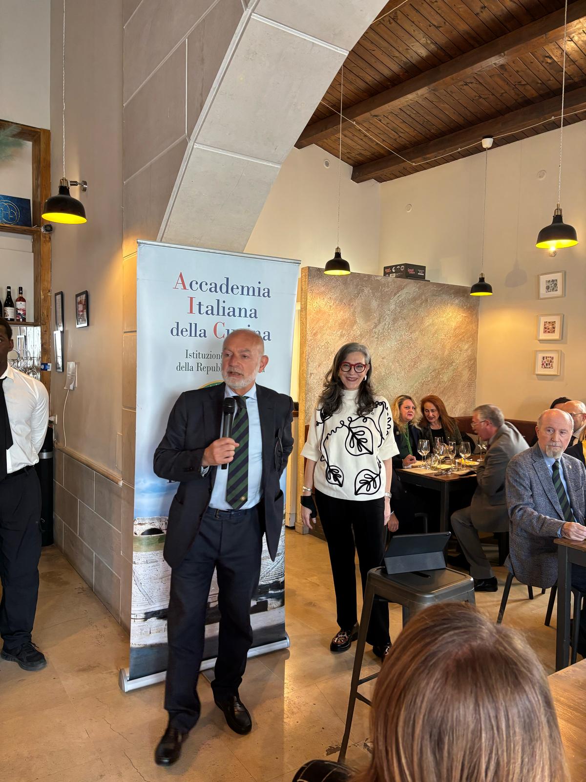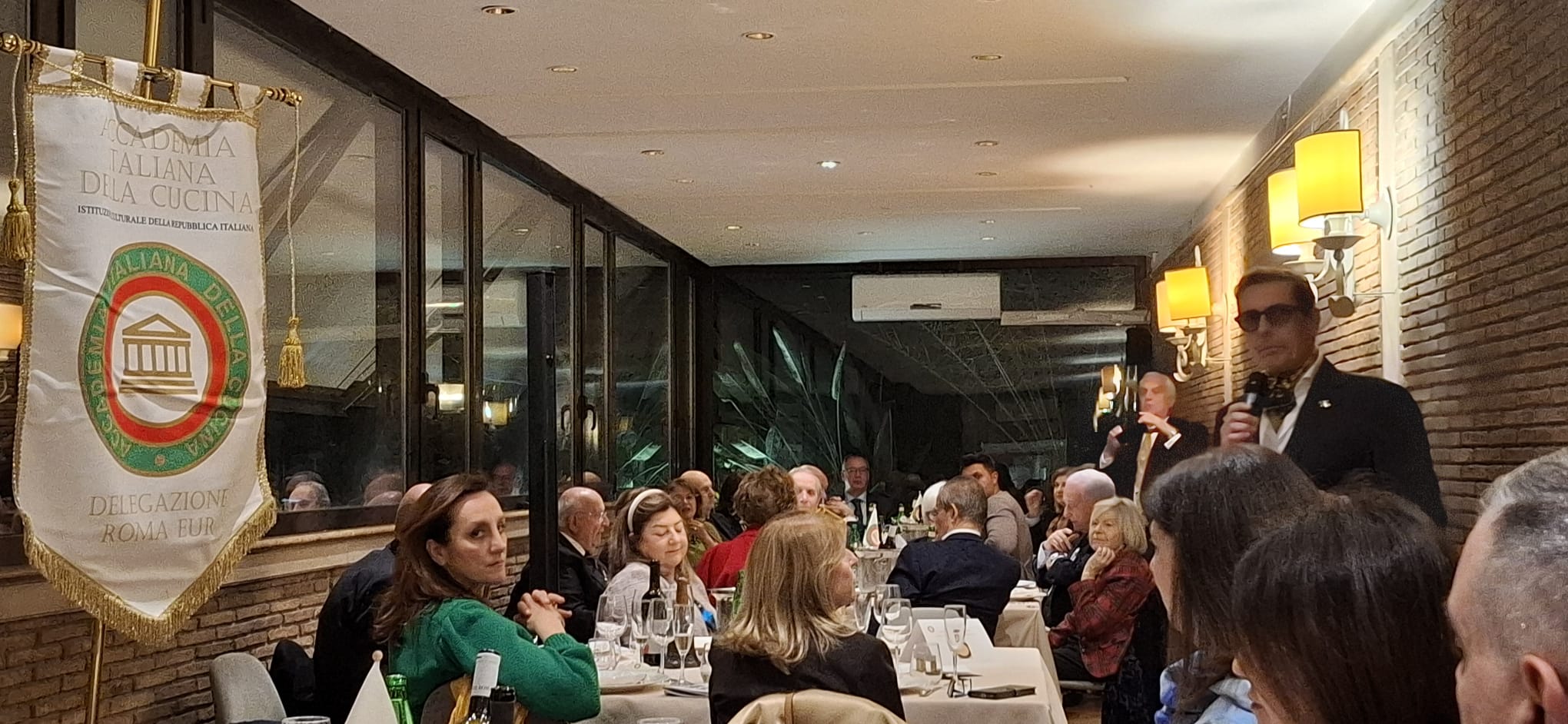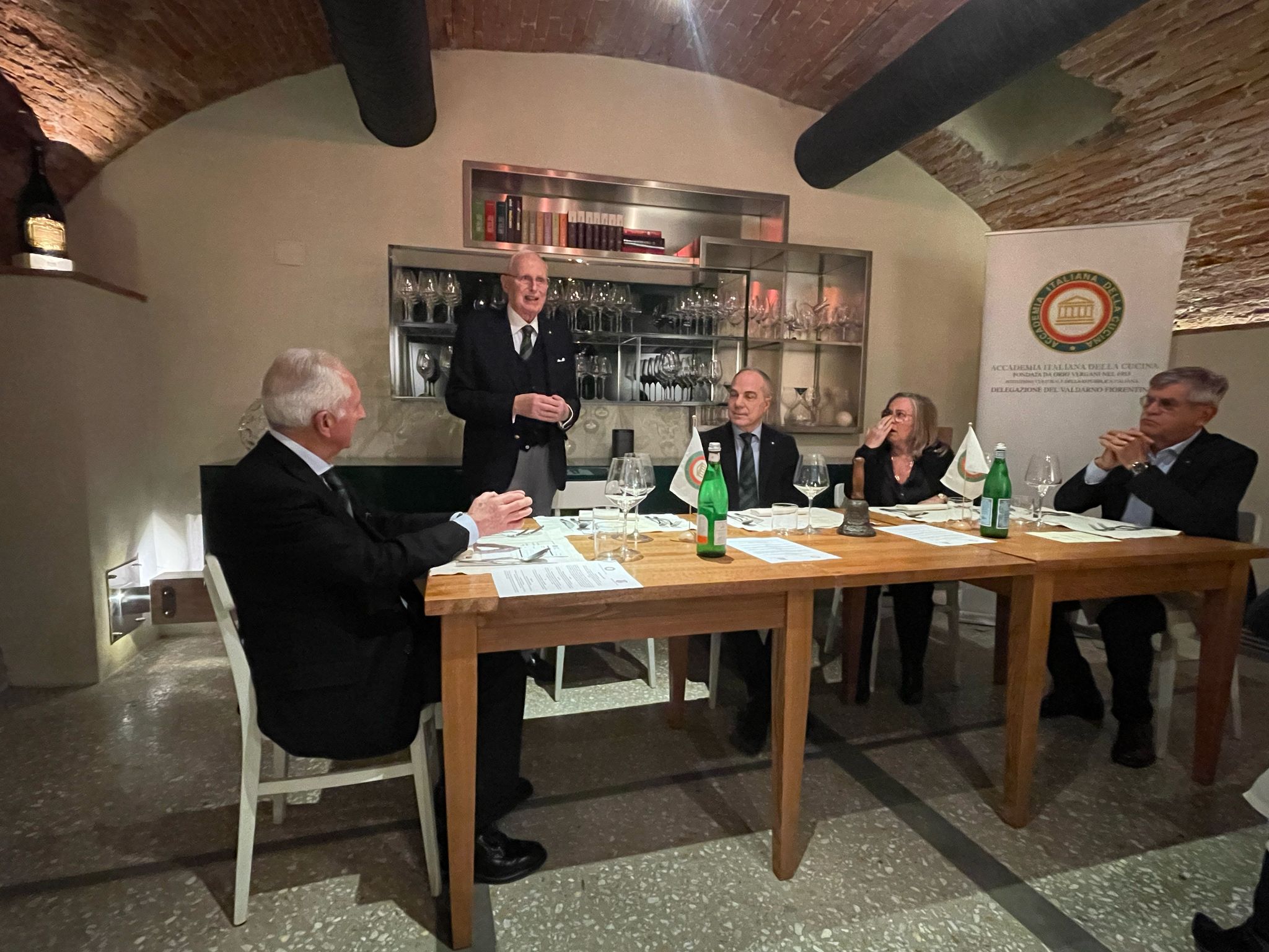 La riunione conviviale della cultura della Delegazione del Valdarno Fiorentino si è svolta all'Hostaria Ceccotoccami, un ristorante situato in un palazzotto trecentesco sul Lungarno di Incisa Valdarno. Alla serata ha partecipato il Segretario Generale dell'Accademia, Roberto Ariani. Il Delegato Sandro Fusari ha scelto come tema “La cucina italiana dal Rinascimento all’Intelligenza Artificiale”. Fusari ha illustrato l’evoluzione della cucina italiana, i cambiamenti nei secoli e i personaggi che hanno influenzato le tradizioni e l’esportazione della cultura italiana nel mondo (foto 1). Ariani ha poi mostrato come l’IA possa generare ricette innovative in pochi secondi e ha ricordato l’impegno del Presidente dell’Accademia, Paolo Petroni, per la candidatura della cucina italiana come patrimonio immateriale dell’Unesco (foto 2). Il menù, concordato con lo chef Davide Boni, includeva un aperitivo con schiacciata fatta in casa e prosecco, seguito da fagottino di mazzancolle e ricotta, ombrina e gamberone su crema di cipolle all’arancia, e tartellette con crema pasticcera e mele caramellate (foto 3). Tutti i piatti sono stati molto apprezzati. In abbinamento, Vermentino Toscana IGT Il Palazzo. A fine serata, Ariani e Fusari hanno ringraziato Boni e la brigata di sala, donando il libro dell’Accademia “Storia della cucina italiana a fumetti” (foto 4).