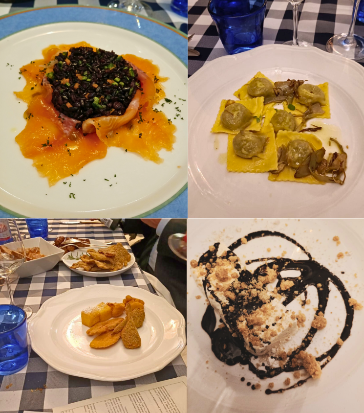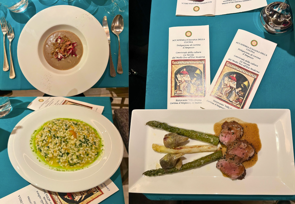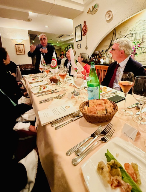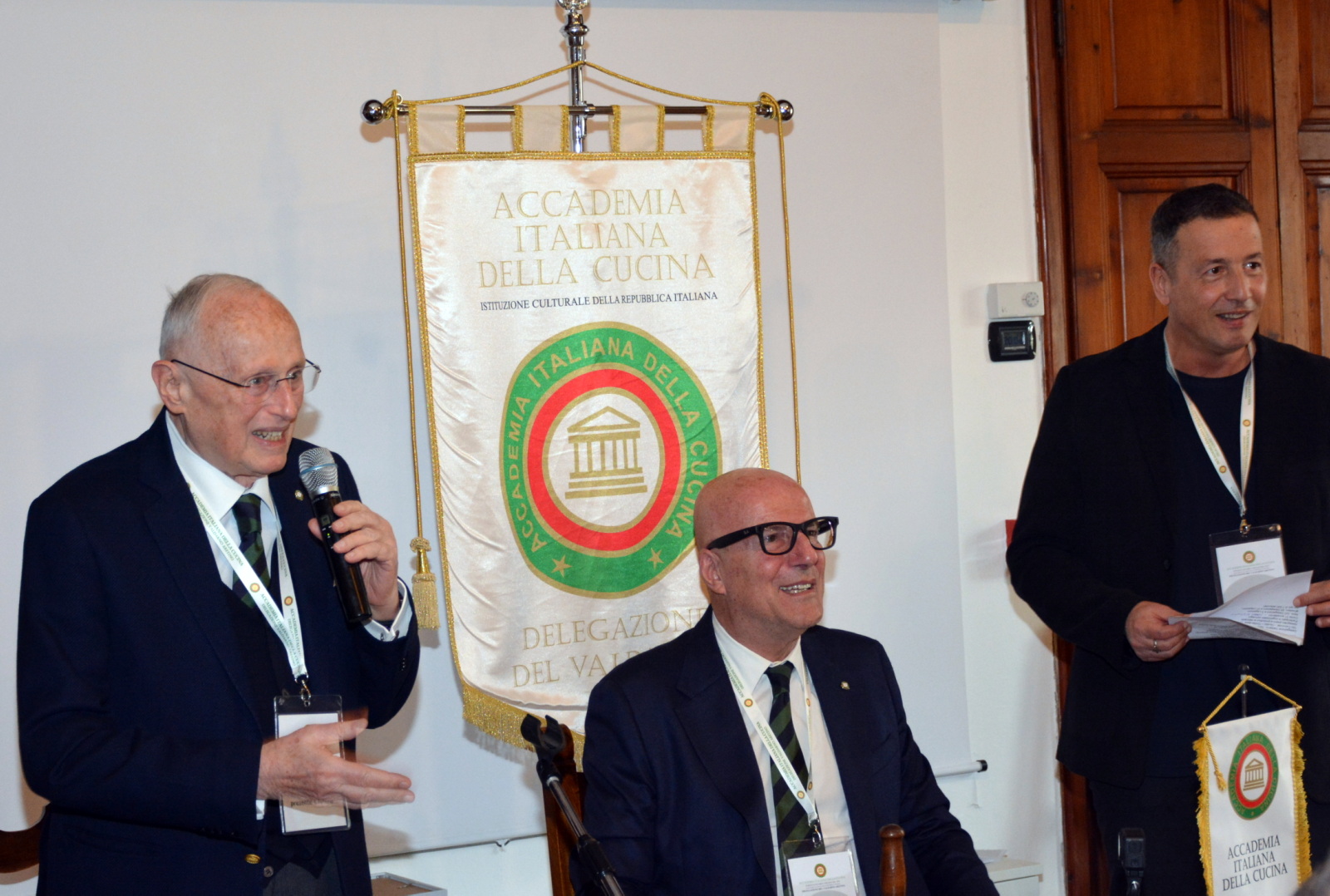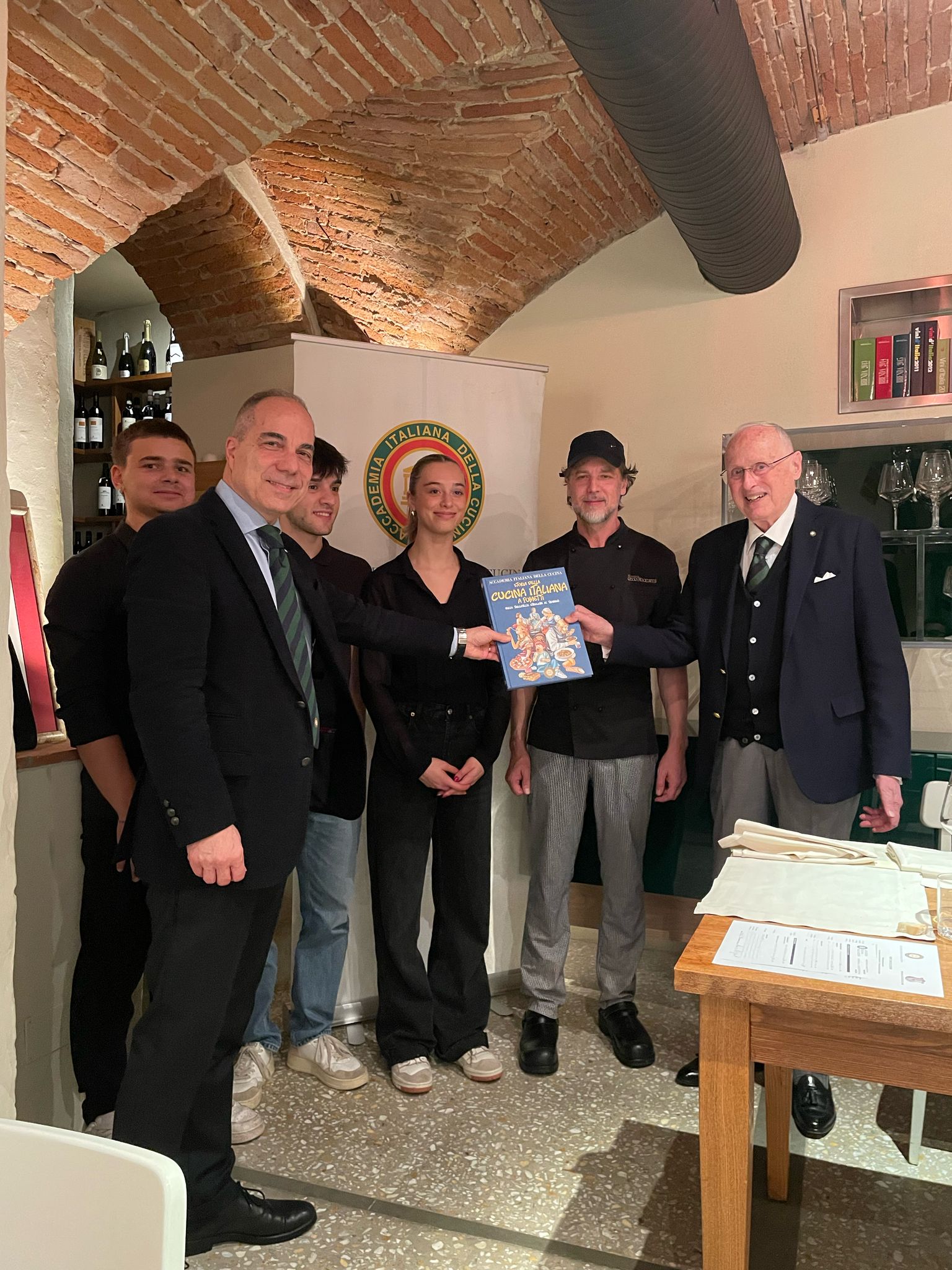 La riunione conviviale della cultura della Delegazione del Valdarno Fiorentino si è svolta all'Hostaria Ceccotoccami, un ristorante situato in un palazzotto trecentesco sul Lungarno di Incisa Valdarno. Alla serata ha partecipato il Segretario Generale dell'Accademia, Roberto Ariani. Il Delegato Sandro Fusari ha scelto come tema “La cucina italiana dal Rinascimento all’Intelligenza Artificiale”. Fusari ha illustrato l’evoluzione della cucina italiana, i cambiamenti nei secoli e i personaggi che hanno influenzato le tradizioni e l’esportazione della cultura italiana nel mondo (foto 1). Ariani ha poi mostrato come l’IA possa generare ricette innovative in pochi secondi e ha ricordato l’impegno del Presidente dell’Accademia, Paolo Petroni, per la candidatura della cucina italiana come patrimonio immateriale dell’Unesco (foto 2). Il menù, concordato con lo chef Davide Boni, includeva un aperitivo con schiacciata fatta in casa e prosecco, seguito da fagottino di mazzancolle e ricotta, ombrina e gamberone su crema di cipolle all’arancia, e tartellette con crema pasticcera e mele caramellate (foto 3). Tutti i piatti sono stati molto apprezzati. In abbinamento, Vermentino Toscana IGT Il Palazzo. A fine serata, Ariani e Fusari hanno ringraziato Boni e la brigata di sala, donando il libro dell’Accademia “Storia della cucina italiana a fumetti” (foto 4).