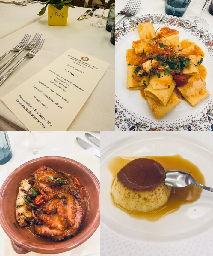 La riunione conviviale della Delegazione di Siracusa al ristorante Astrattu si è rivelata una vera sorpresa. Locale accogliente, arredamento semplice ma ricercato, gestori squisiti e uno chef appassionato che esalta la cucina territoriale, sia nella sua versione tradizionale che in quella innovativa. Degustare piatti tipici siracusani, magistralmente coniugati con ricette e ingredienti di altre regioni d’Italia, presentati in modo originale e abbinati a ottimi vini e birre artigianali, il tutto avvolto da una calorosa accoglienza, rende questo ristorante una meta da non perdere. Un tocco di originalità è sicuramente la pizza al tegamino: un’esplosione di colori e sapori! Il menù della giornata è stato appositamente studiato per essere in linea con il tema della riunione conviviale: la pasta. Il Simposiarca, Accademico Francesco Pusateri, ha piacevolmente intrattenuto i presenti con un’interessante relazione dal titolo: “Non è stato Marco Polo… la pasta non viene dalla Cina”.
