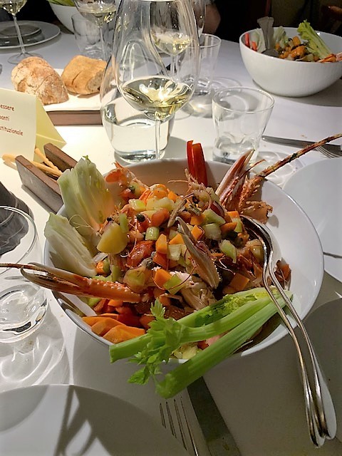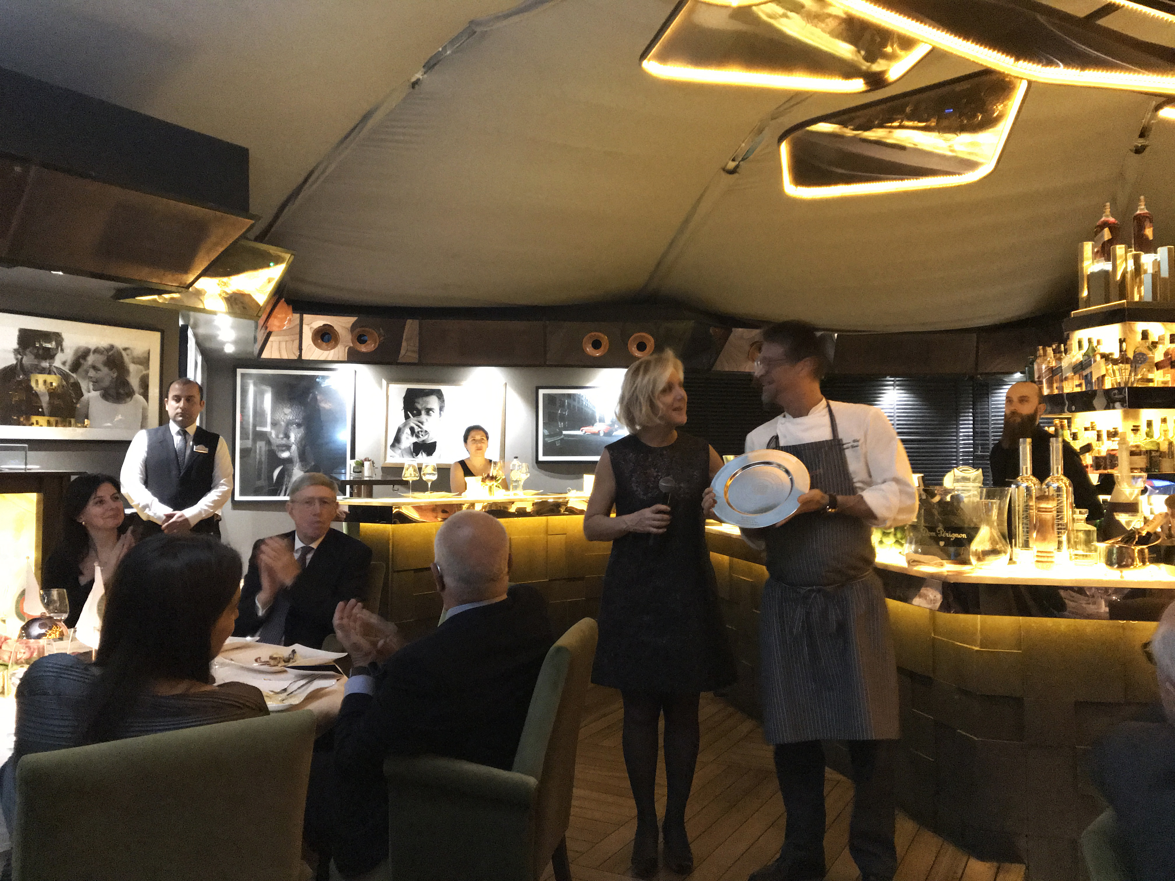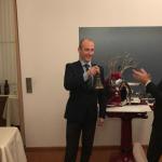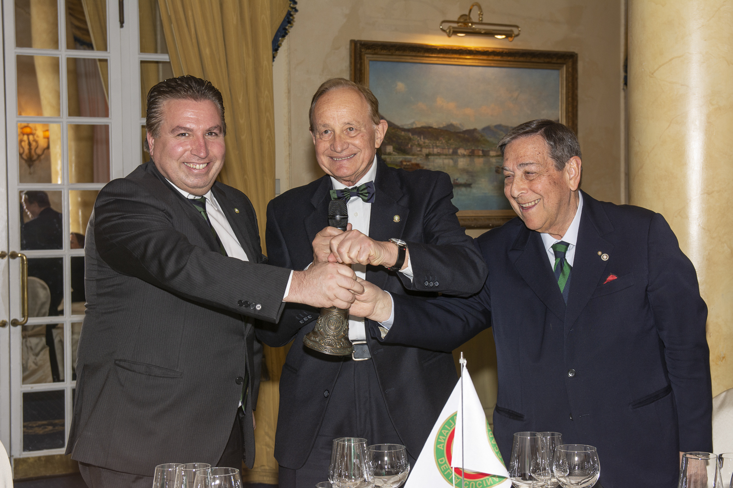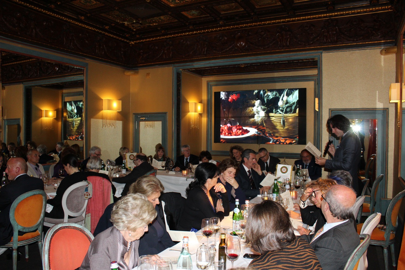 E' avvenuto alla presenza del Presidente Paolo Petroni il passaggio della campana tra il Delegato uscente Paolo Grandi, nominato Delegato onorario, e il neo eletto Delegato Emilio Casati. La cerimonia si è svolta nell'elegante sala dell’Hotel Splendide Royal di Lugano. Foto 1 (da sinistra): i Consultori Alessandro Del Bufalo, Giovanni Frey, Marta Lenzi Repetto, il Delegato onorario Paolo Grandi, il Presidente Paolo Petroni, il Delegato Emilio Casati, il Vice Delegato Massimo Ciocco, il Consultore Segretario Pier Franco Gaggini, i Consultori Francesca Bonifaccio Meschini ed Enea Petrini. Foto 2. Il momento del passaggio della campana. Foto 3. Dal menu: gamberi viola, seppia al vapore, cagliata di latte, caviale di trota e soffice al peperone crusco. Foto 4. torta con logo AIC.