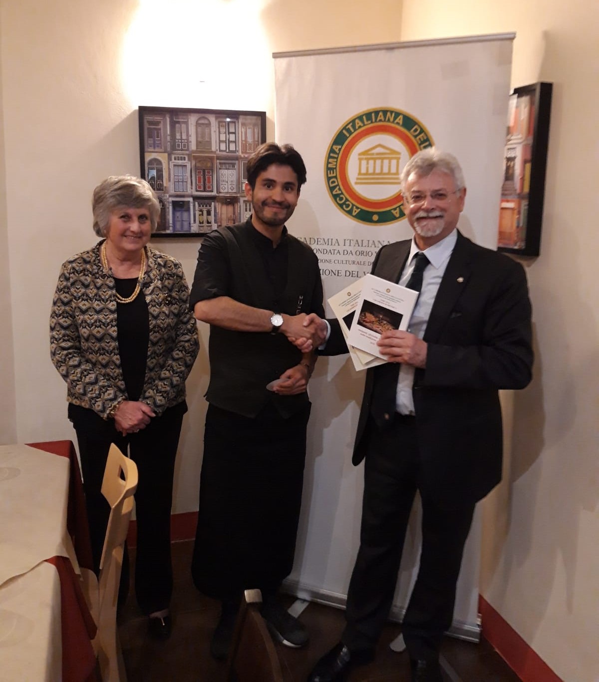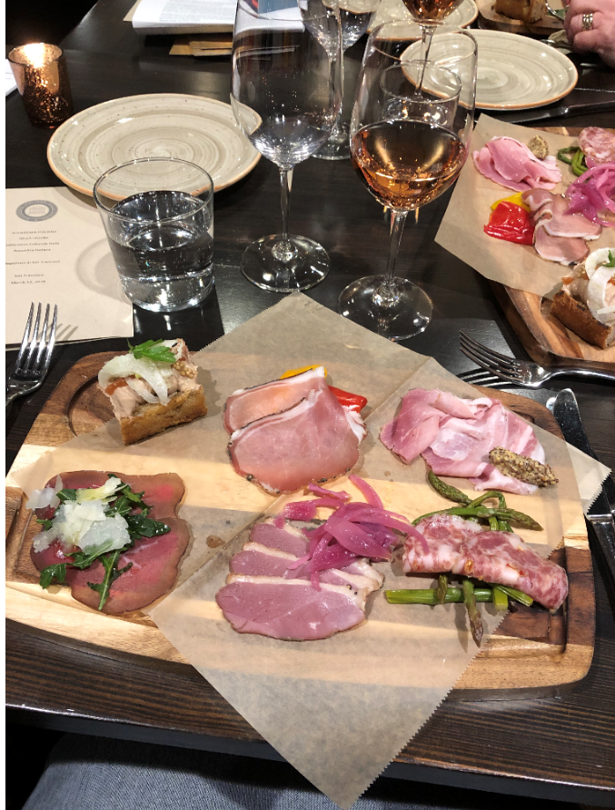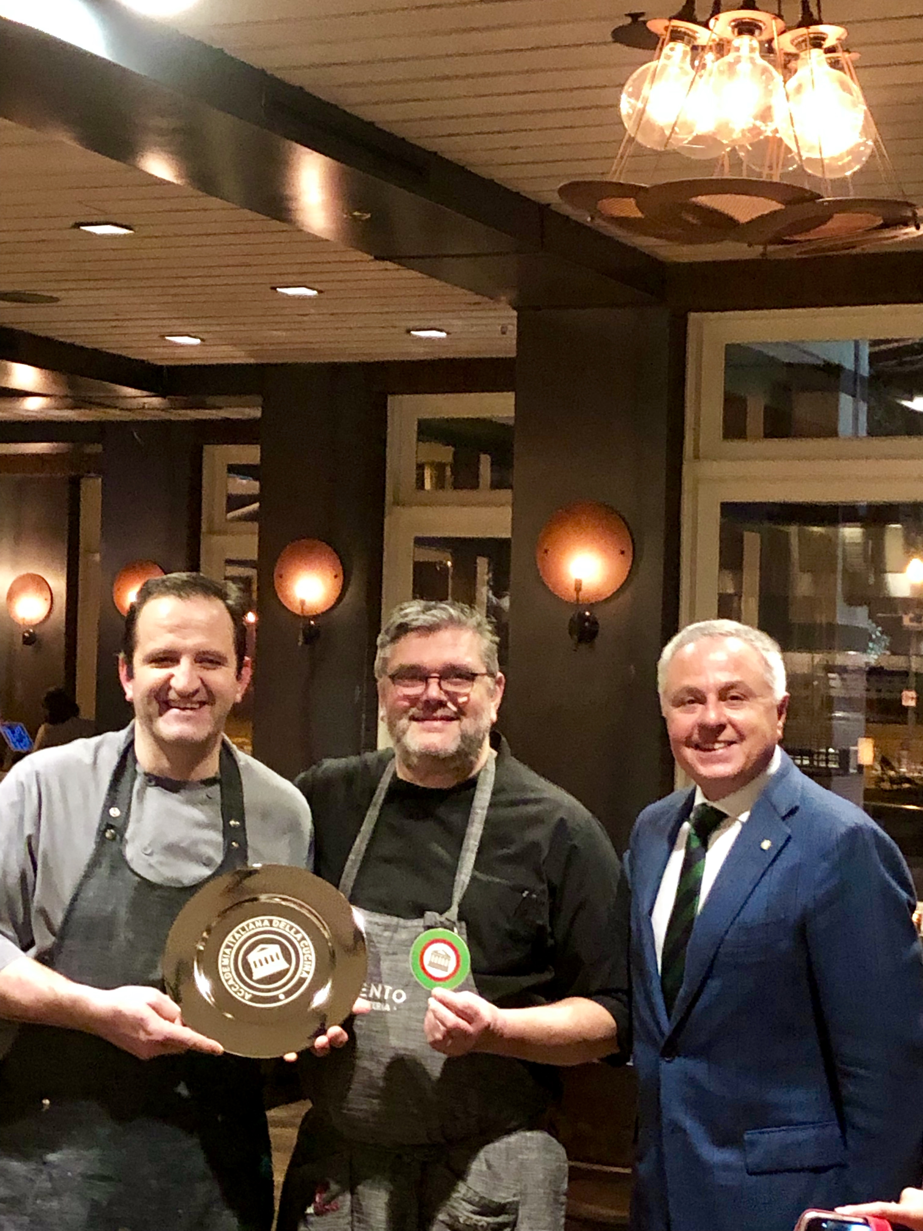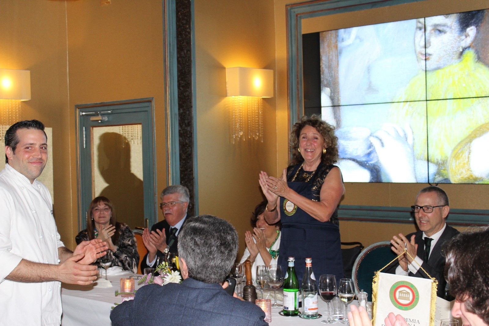 La Delegazione di San Francisco ha organizzato la cena conviviale del mese di marzo dedicata alla Cultura presso "Cento Osteria" (San Francisco). Foto 1: (da sinistra) lo chef e proprietario Donato Scotti, chef e partner Gianluca Guglielmi e il Delegato Claudio Tarchi. Foto 2: Antipasto con salumi e paté di fegatini di pollo fatti in casa. Foto 3: “Scarpinocc" di Parre (Bergamo) nella versione dello chef e proprietario Donato Scotti. Foto 4: menu e campana accademica.