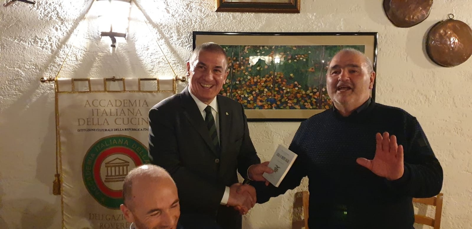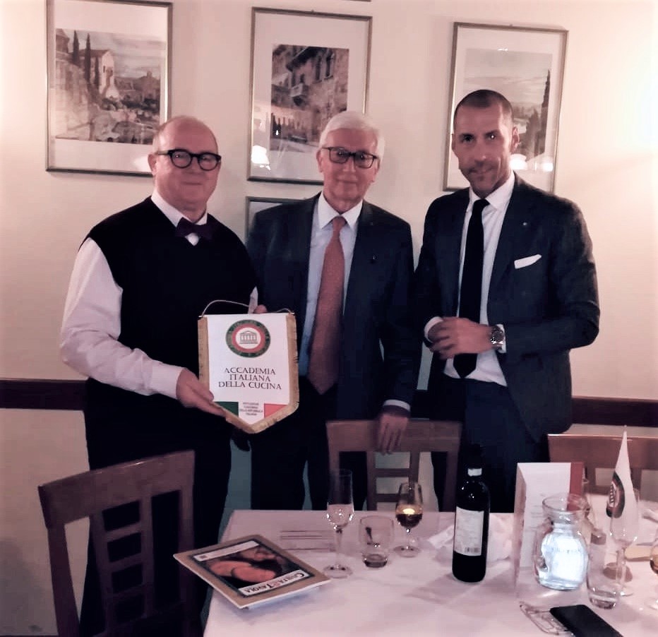 Il ristorante “Hidalgo” di Postal ha ospitato la cerimonia del passaggio della campana tra il Delegato uscente Raoul Ragazzi ed Emanuele Nobili (foto 1 a sinistra Emanuele De Nobili, a destra Raoul Ragazzi). La serata è stata molto partecipata e per l’occasione erano presenti, in segno di amicizia e stima, altri Delegati della Regione: Stefano Hauser di Trento, Germano Berteotti di Rovereto e Piergiorgio Baruchello di Bressanone (foto 2). Foto 3. Il Delegato con la campana dell'Accademia. Foto 4: il Delegato De Nobili consegna al maÎtre di sala il piatto dell'anno 2019 sul tema “le paste fresche, ripiene e gli gnocchi”.