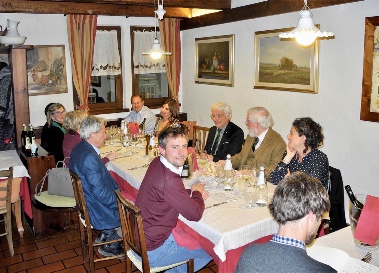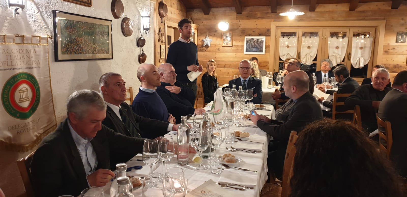 La riunione conviviale della Delegazione di Rovereto si è svolta presso il ristorante "Maso Palù" di Brentonico. Foto 1: il Delegato Germano Berteotti e l'Accademica Cristiana Giovanazzi celebrano il secondo anniversario della Delegazione. Foto 2: il Delegato con Imerio Lorenzini che ha tenuto una relazione su “La flora del Baldo”. Foto 3: un momento della cena a cui ha partecipato il campione di ciclismo Francesco Moser (primo a destra). Foto 4: (da sinistra) Walter Nicoletti relatore di "Agricoltura e alimentazione", il Delegato, il Sindaco del Comune di Brentonico arch. Christian Perenzoni, Imerio Lorenzini, Tobia Giradelli titolare del ristorante (in piedi) e il Simposiarca e Consultore Filippo Tranquillini.