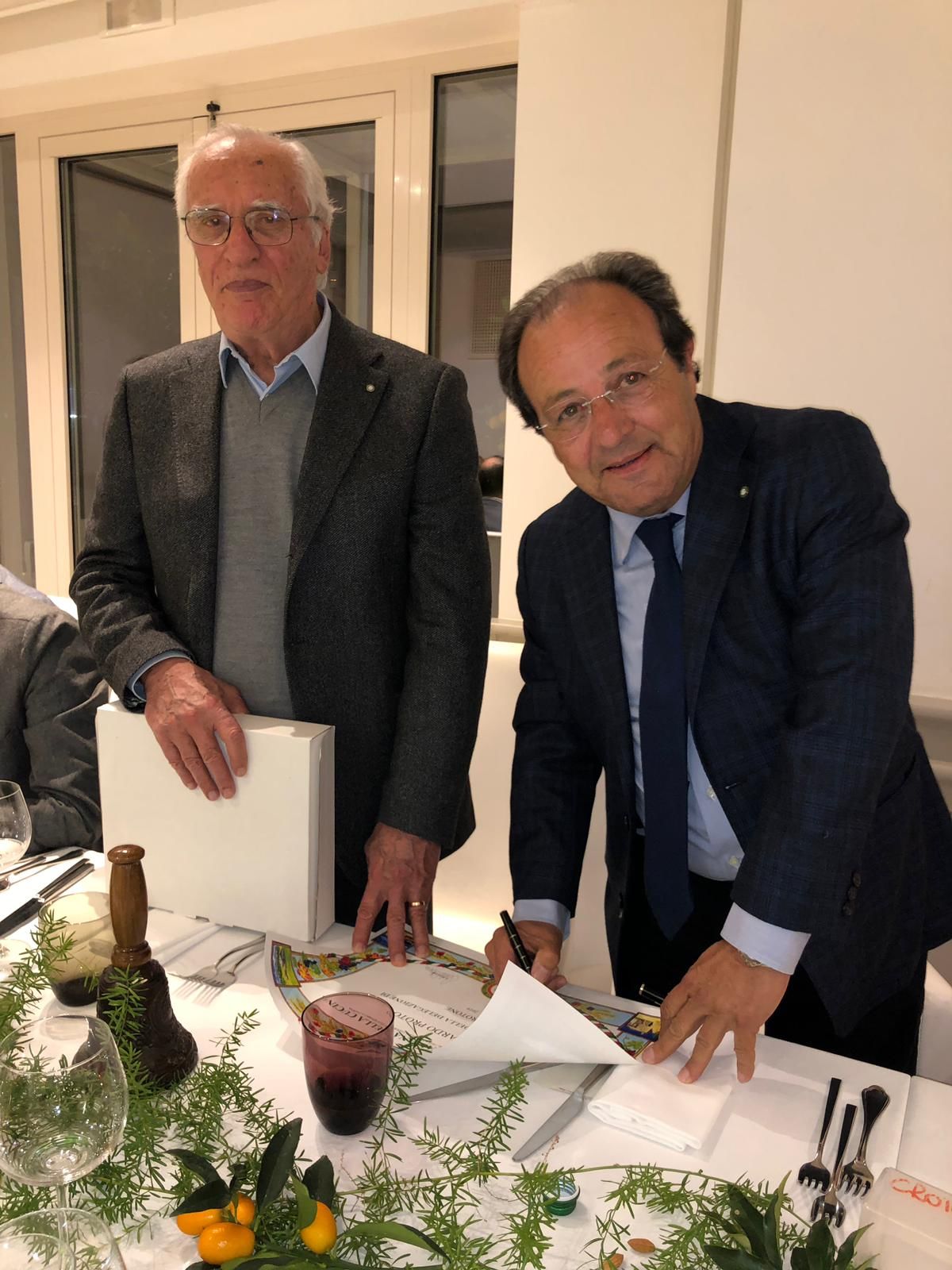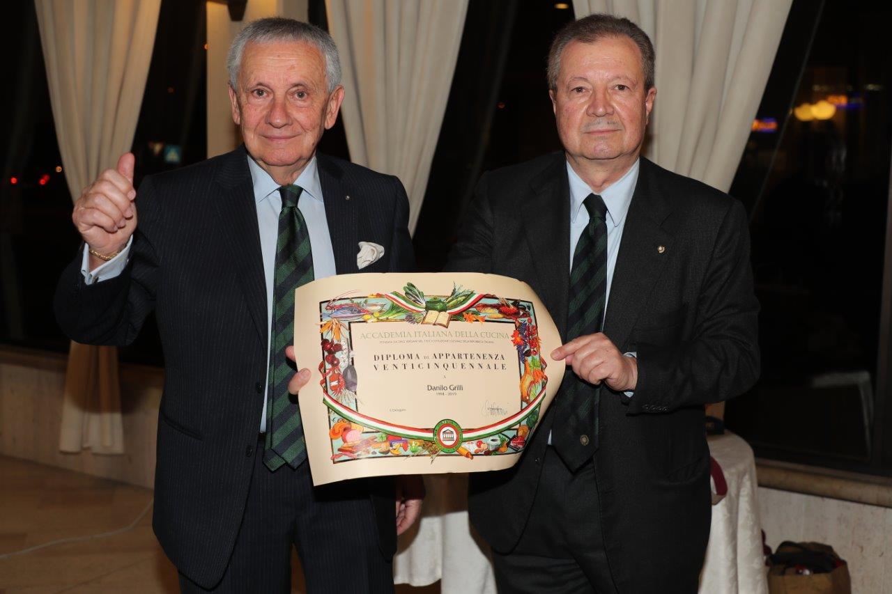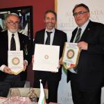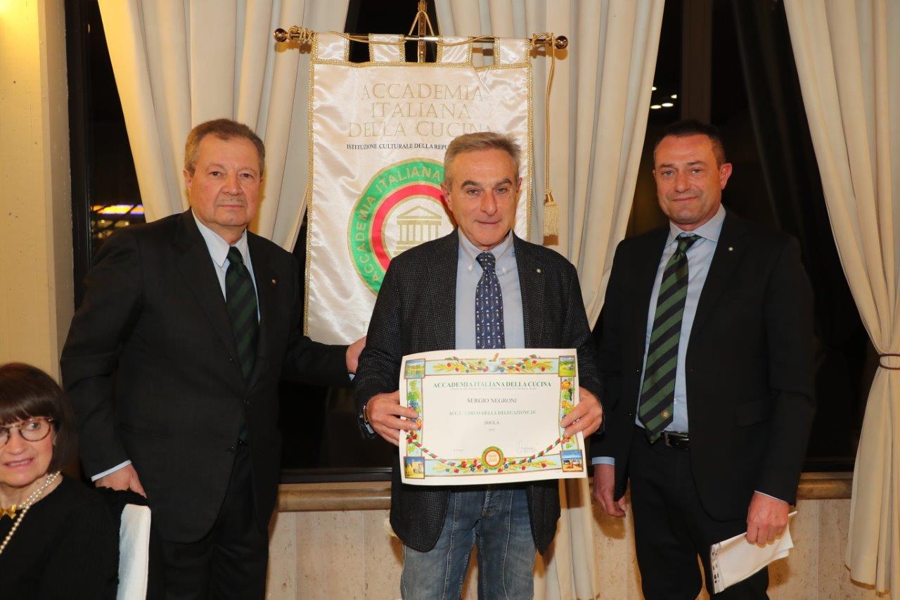 La Delegazione di Imola si è ritrovata per la riunione conviviale di marzo al ristorante "Molino Rosso" di Imola sul tema "Chimica e fisica per cucinare bene". Foto 1. Marino Ragazzini, Gran Prevosto della Dotta Confraternita del tortellino. ll Delegato Antonio Gaddoni consegna il diploma di appartenenza trentacinquennale a Giuseppe Gonni (foto 2) e venticinquennale a Danilo Grilli (foto 3). Foto 4. Nuovo Accademico Sergio Negroni.