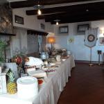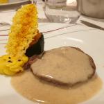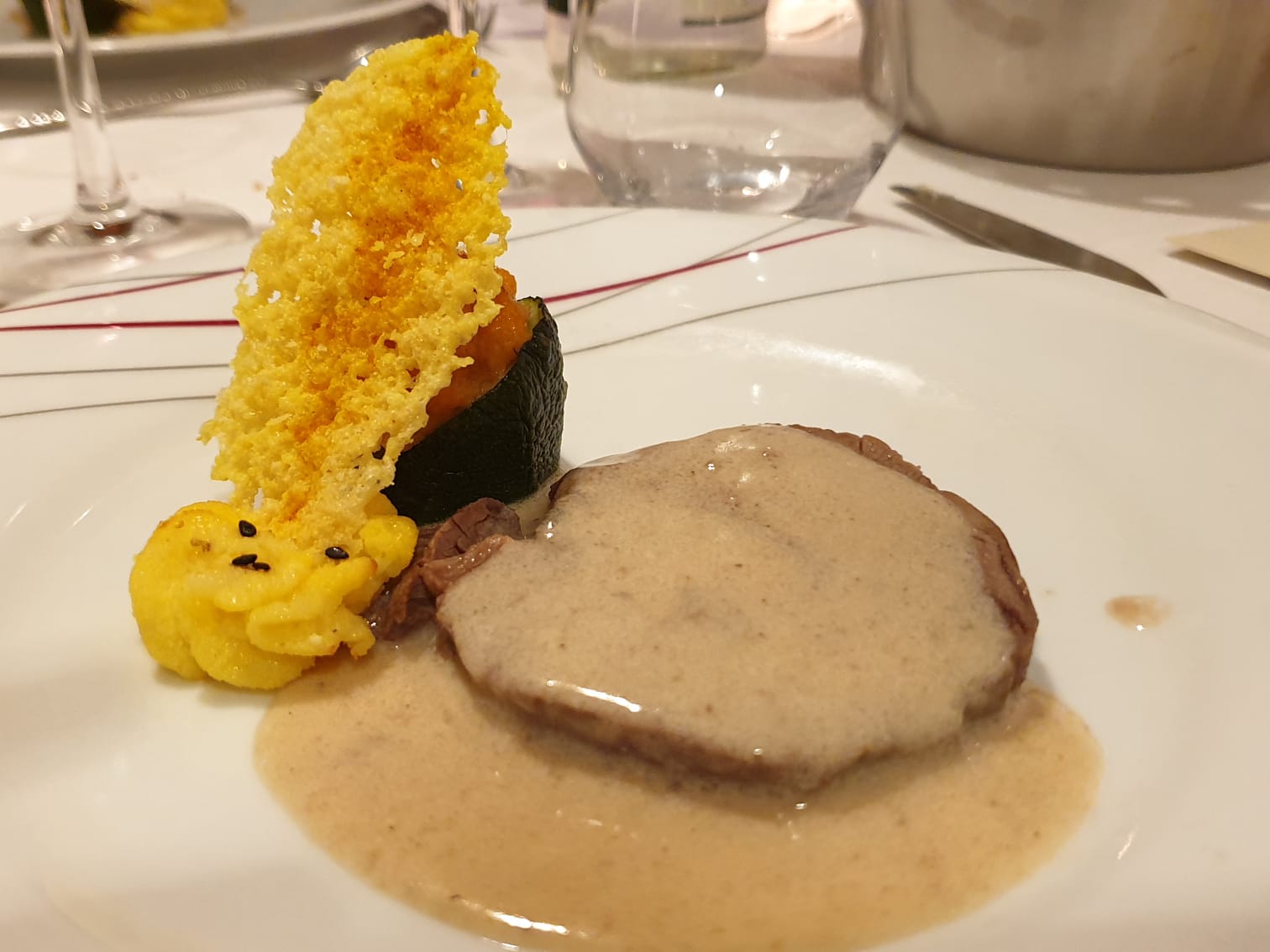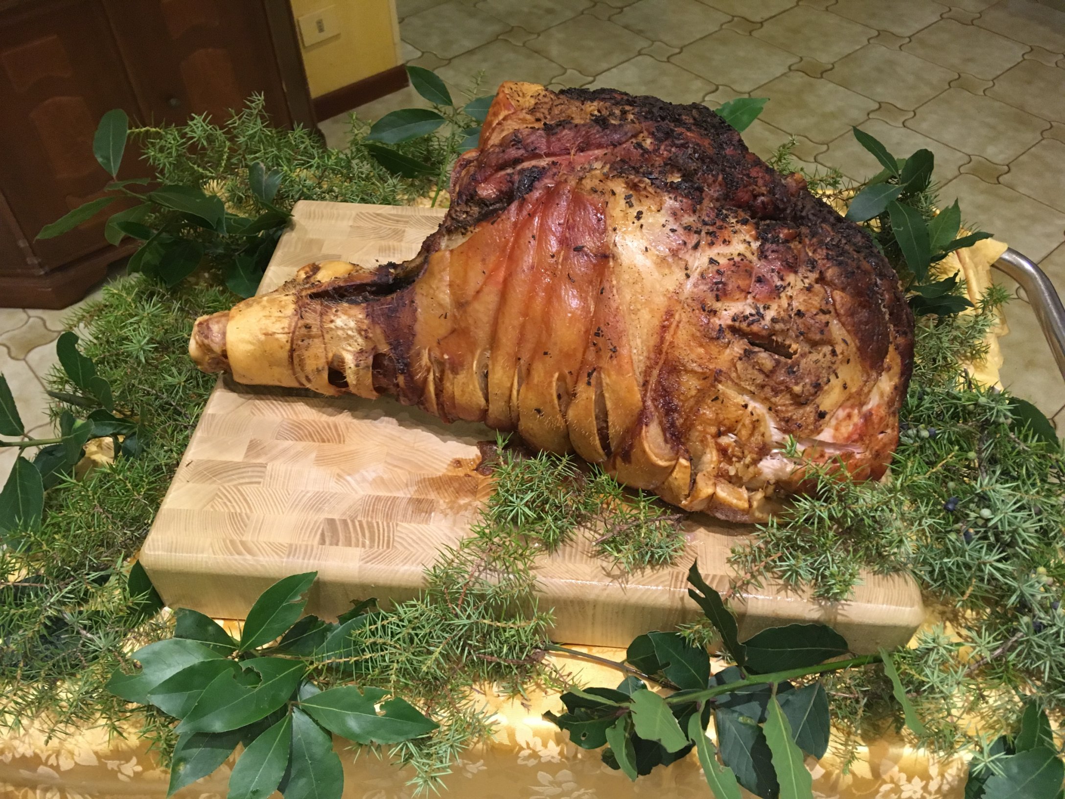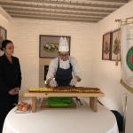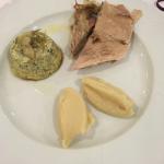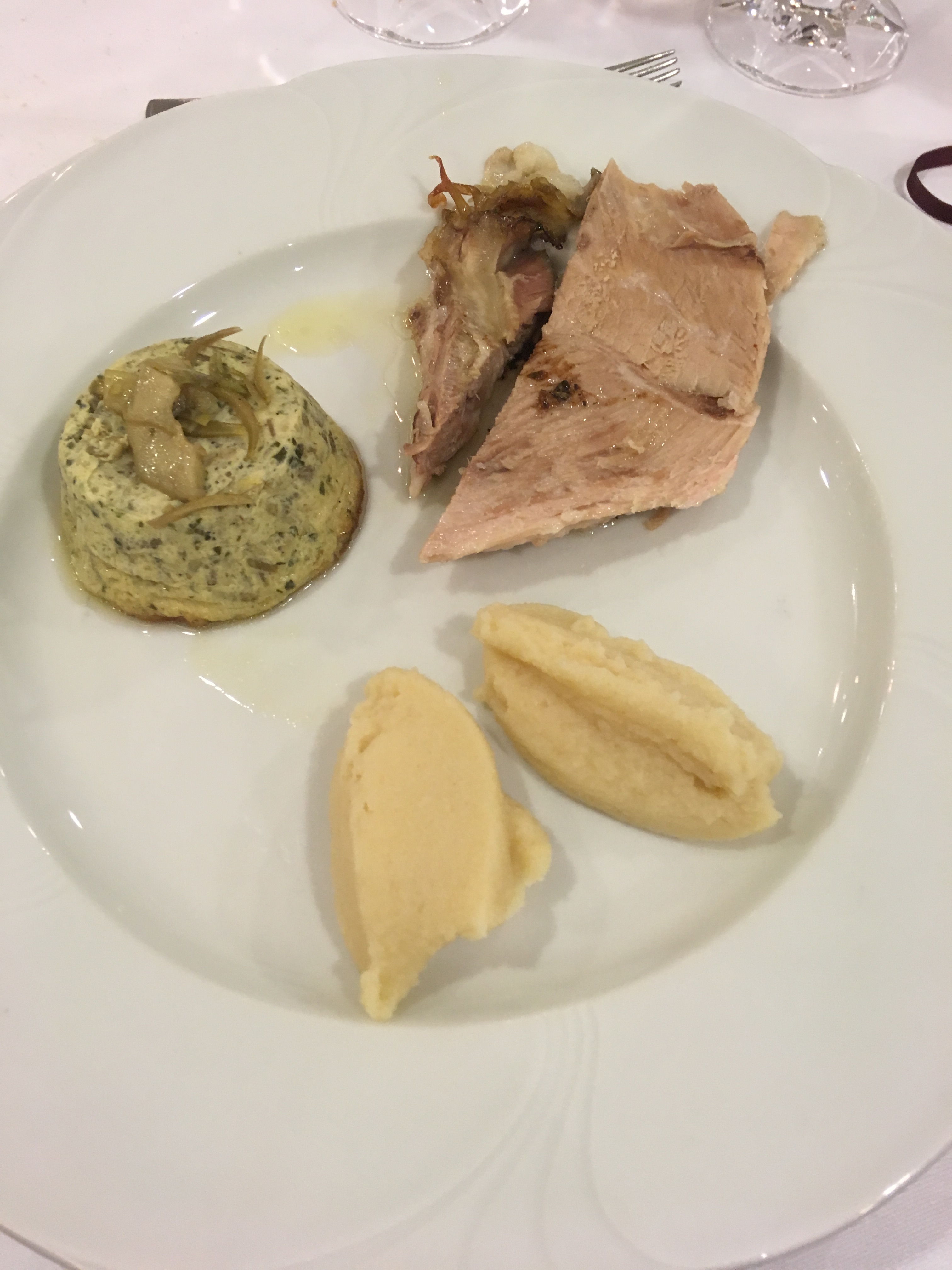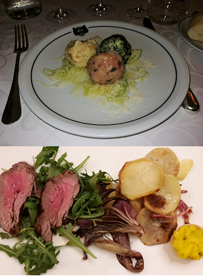 La conviale dedicata al mese della Cultura della Delegazione del Mugello si è tenuta presso il ristorante "Marrani" a Ronta (FI) sul tema "Leonardo, le macchine per la cucina e i carciofi" illustrato dal Vicedelegato Renzo Bartoloni. Foto 1. la tavola con Accademici e ospiti. Foto 2. La Delegata Monica Sforzini consegna il guidoncino e la vetrofania dell'Accademia a Daniela Aiazzi e Francesco Ronconi e la loro brigata. Foto 3. Il prosciutto arrosto aromatizzato alle erbe. Foto 4. Il secondo piatto con arrosto, tortino di carciofi e purè di sedano rapa.