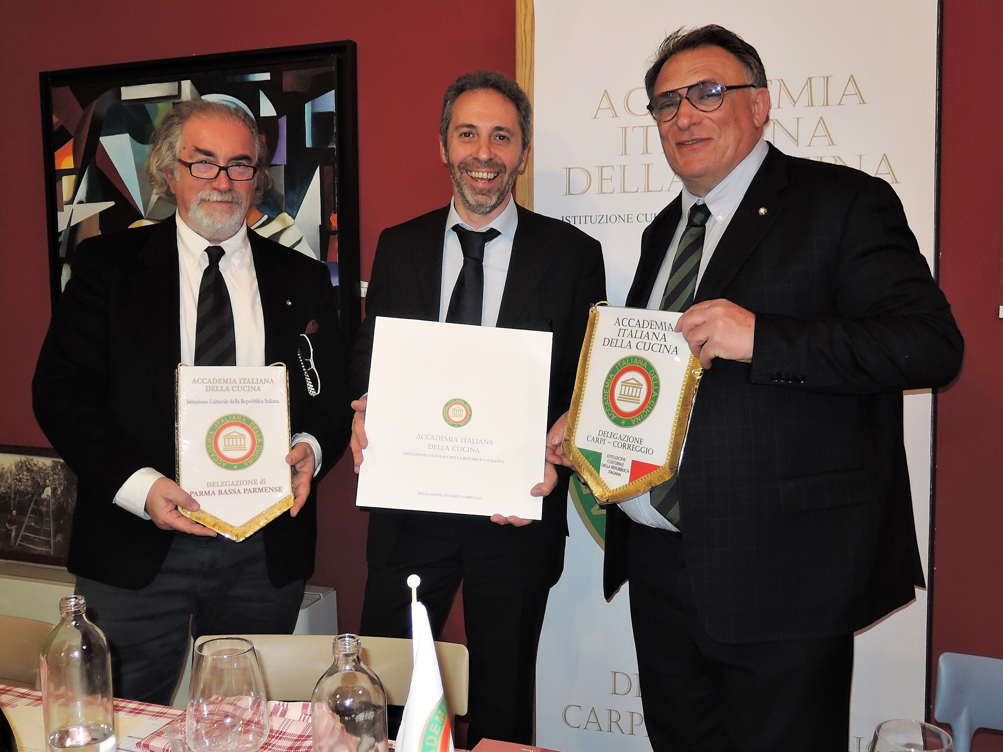 La Delegazione di Carpi-Correggio ha organizzato una riunione conviviale presso la "Trattoria Cognento" a Carpi. Ospiti della serata, il Delegato di Parma-Bassa Parmense Giulio Dall'Olio e il Segretario della Delegazione Pietro Silva che hanno argomentato sulle paste fresche ripiene, tema dell'anno 2019. Foto 1 (da destra): il Delegato di Carpi-Correggio Pier Paolo Veroni, Pietro Silva e il Delegato Giulio Dall'Olio. Foto 2: il Delegato Veroni e la brigata di cucina. Foto 3: il menu della serata.
