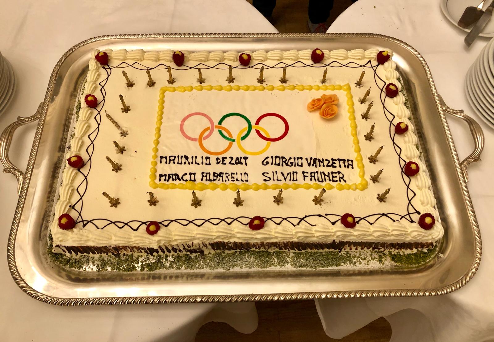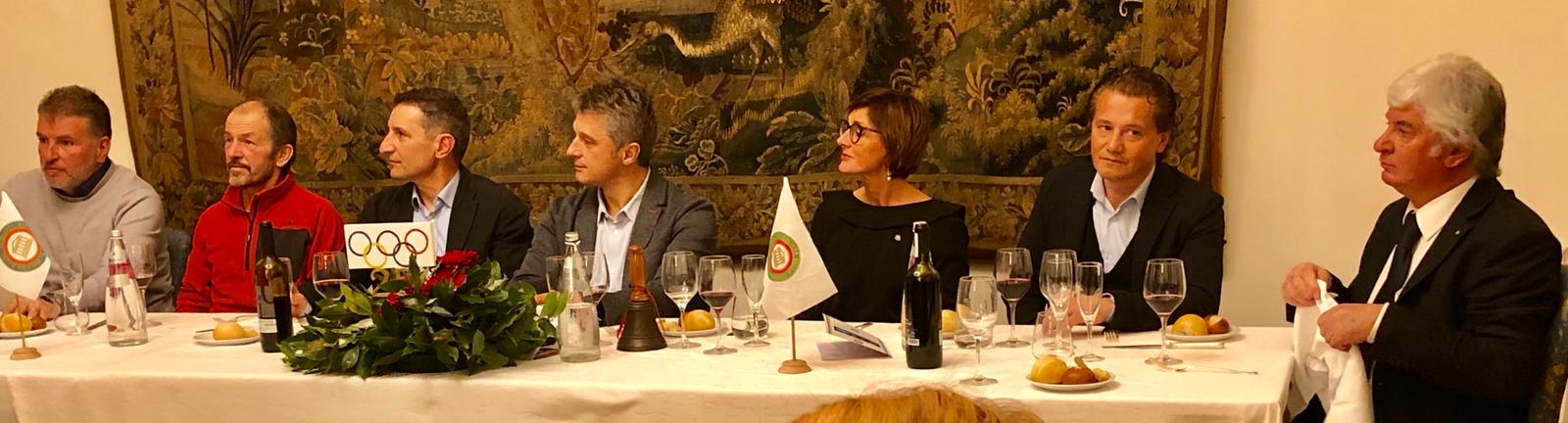 La Delegazione di Cortina d'Ampezzo, in occasione del 25° anniversario della conquista della medaglia d’oro alle Olimpiadi invernali di Lillehammer, ha organizzato un incontro con gli atleti olimpionici Maurilio De Zolt, Marco Albarello, Giorgio Vanzetta e Silvio Fauner. L'incontro ha preceduto la riunione conviviale sul tema "A tavola con i Campioni” tenutasi presso l'Hotel de La Poste. La staffetta si è dunque ritrovata a tavola e ciascun Olimpionico ha scelto il suo piatto preferito secondo l'ordine della staffetta: Maurilio De Zolt il "lancio" con l'antipasto (foto 2), Marco Albarello il primo piatto e Giorgio Vanzetta il secondo (foto 3); Silvio Fauner ha chiuso con lo "sprint" del dolce (foto 4). Numerosi gli Accademici di altre Delegazioni e gli ospiti intervenuti a festeggiare i Campioni. Foto 1. (da sinistra): Albarello, De Zolt, Vanzetta, Fauner, Delegata Monica De Mattia, Sindaco di Cortina Gianpietro Ghedina, Simposiarca Diego Dipol.
