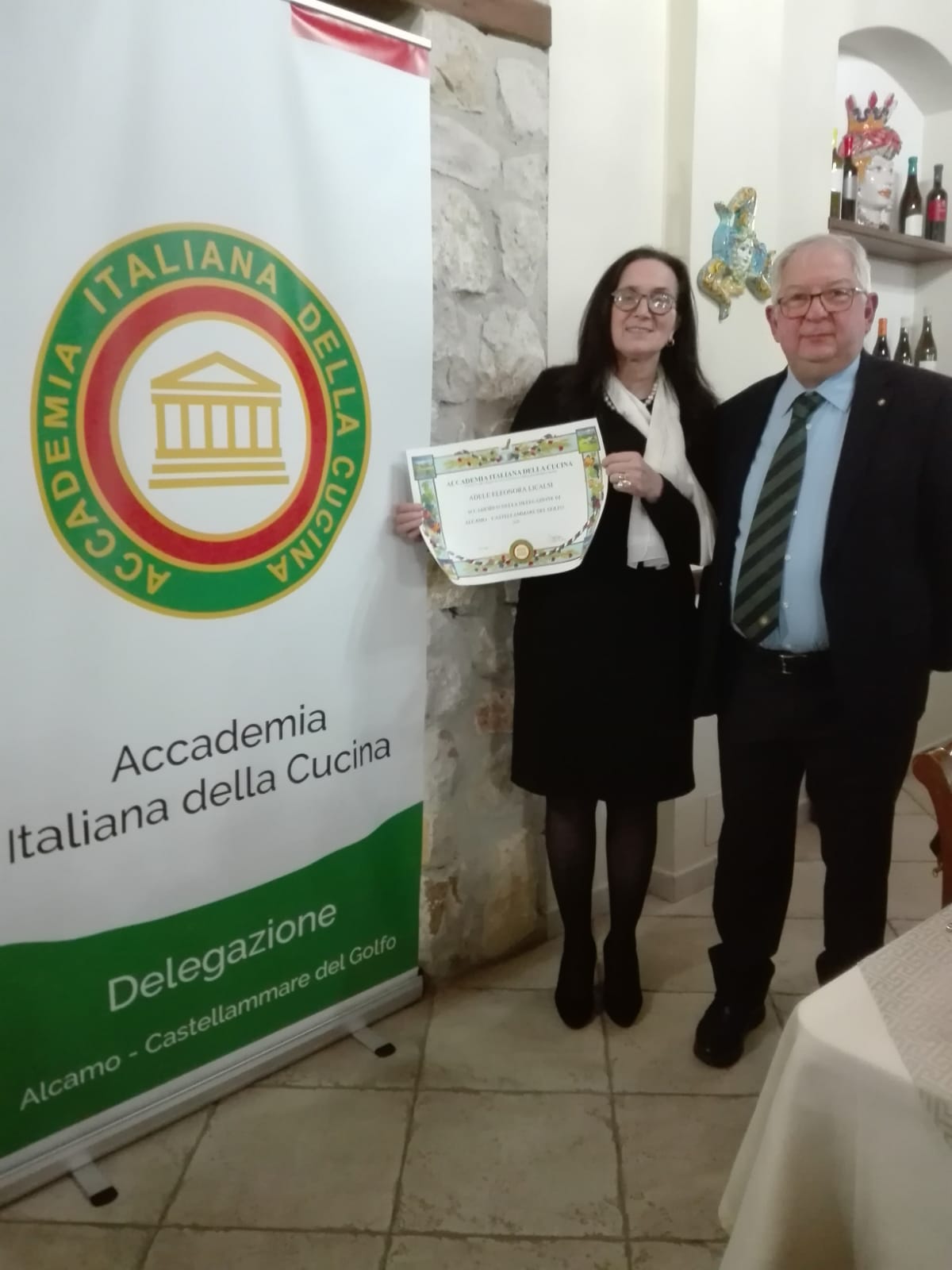 La Delegazione di Alcamo-Castellammare del Golfo si è riunita in occasione della riunione conviviale presso il ristorante "Villa Ambrosia" a Borgetto. Foto 1: il Delegato Liborio Cruciata consegna il distintivo e l'attestato alla neo Accademica Eleonora Licalsi. Foto 2: un momento della cena. Foto 3: momento conclusivo della riunione conviviale.