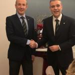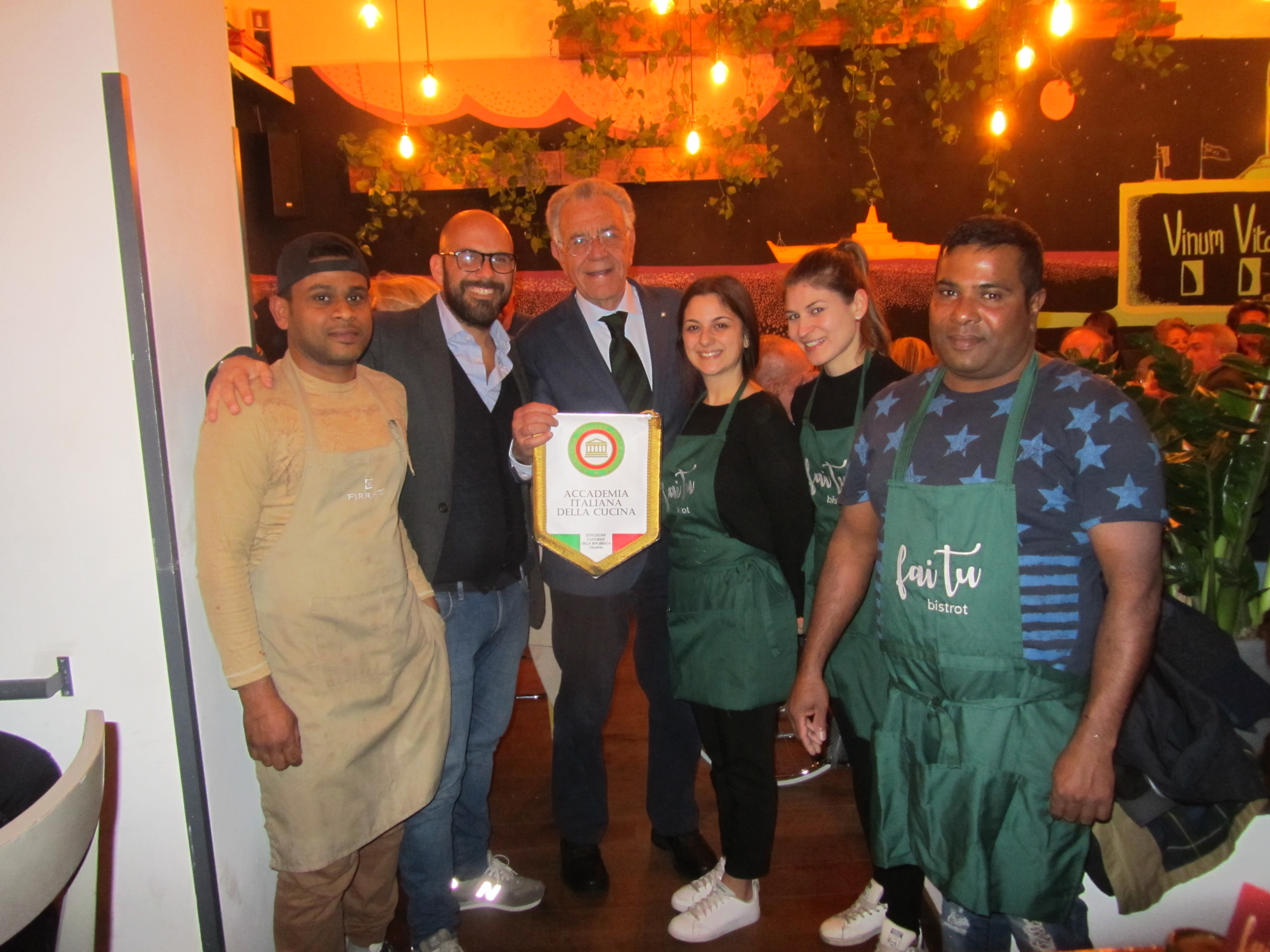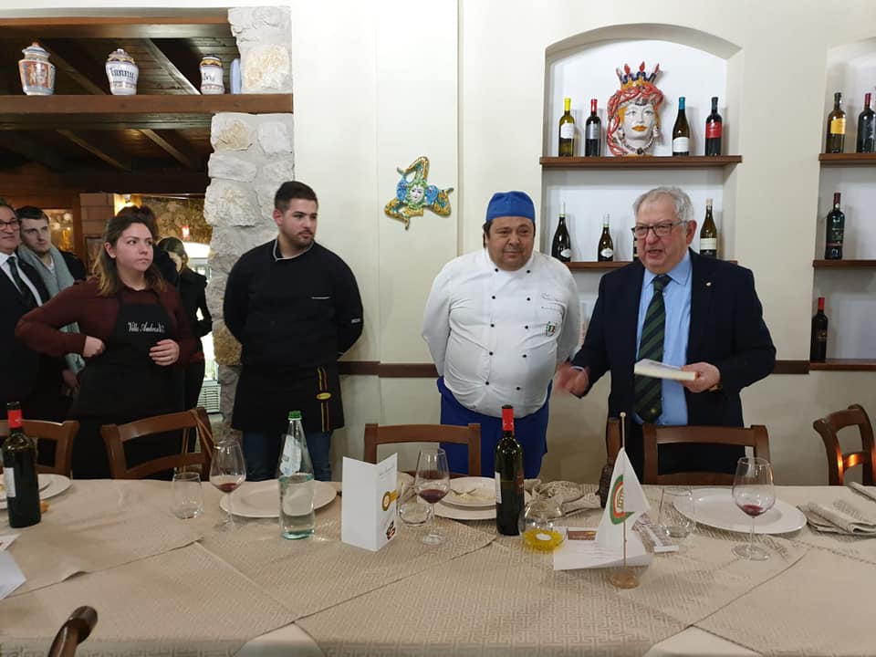 La Delegazione di Messina si è ritrovata presso il “Fai tu bistrot” per la riunione conviviale di Carnevale. Foto 1: la sala con Accademici e ospiti. Foto 2: Il Delegato Francesco Trimarchi consegna il guidoncino a Nino Barbaro e alla sua squadra.