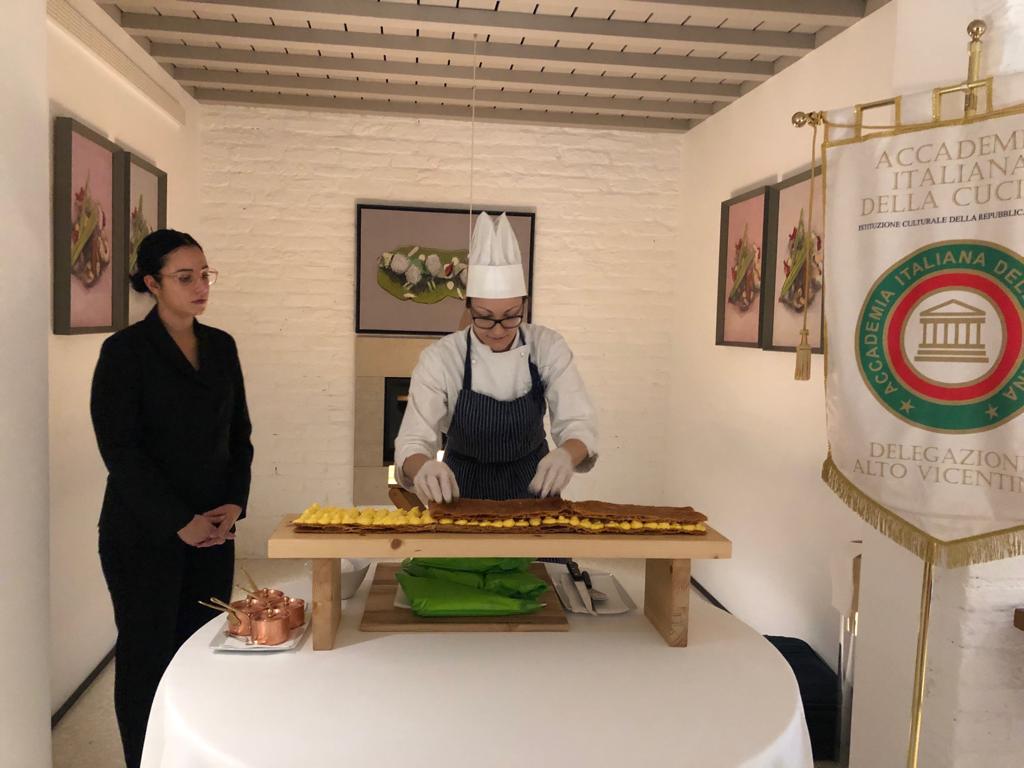 Le Delegazioni dell'Alto Vicentino e di Venezia Mestre si sono ritrovate presso "Antica Osteria Cera" di Lughetto di Campagna Lupia (VE) in occasione della riunione conviviale. Foto 1 (da sinistra): i Delegati Renzo Rizzi (Alto Vicentino) e Franco Zorzet (Venezia Mestre) con Lionello Cera. Foto 2: spaghettino freddo con lucerna, mazzancolla, salsa di pistacchio di Bronte ed acqua di capperi. Foto 3: : catalana di aragosta e crostacei con verdure. Foto 4: preparazione della millefoglie.