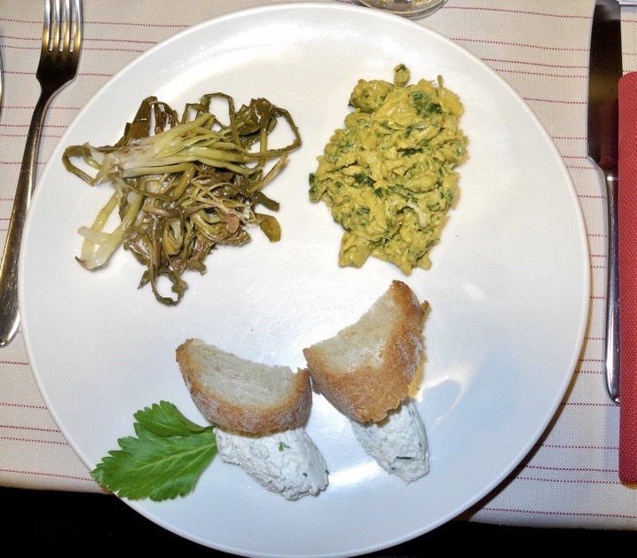La Delegazione di Belluno-Feltre-Cadore si è ritrovata presso l'Osteria dal Conte in località Salmenega di Santa Giustina (BL) per la riunione conviviale dedicata alla Cultura. Tema della serata "Digiuno, cultura e religione". Foto 1. Da sinistra: Il Simposiarca Luigi Cazzola, il Delegato Brenno Dal Pont, i relatori prof. Francesco Piero Franchi (Accademico Onorario) e il dott. Ernesto Riva. Foto 2. un momento della cena. Foto 3. Srapazzata alle ortiche, ricottina di capra alle erbette, tarassaco marinato.