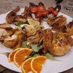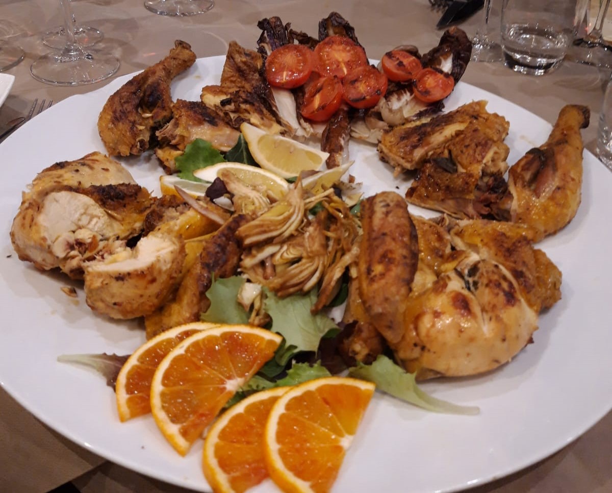 La Delegazione del Valdarno Fiorentino si è ritrovata al ristorante "Borroncino" di Reggello (FI) per la ruinione conviviale dedicata alla Cultura. Tema dell'incontro conviviale: "C'era una volta il pranzo della domenica". Foto 1: la Simposiarca Antonella Bizzarri, uno dei gestori Kevin Sandoval Vasquez, il Delegato Ruggero Larco. Foto 2: vassoio del pollo al mattone.