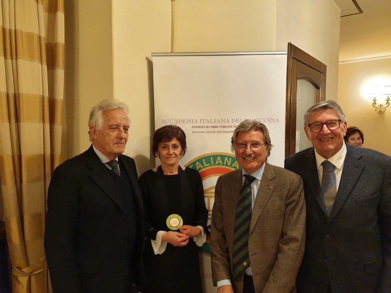 La Delegazione di Novara si riunita al Ristorante Macrì di Trecate per il terzo incontro di assaggio e di ricerca sulla “Paniscia“ risotto tipico novarese. Foto 1: Riccardo Gagliardi e Vittorio Tarditi neo Accademici, il Delegato Piero Spaini, la cuoca e titolare Maria Cristina Pagani.
