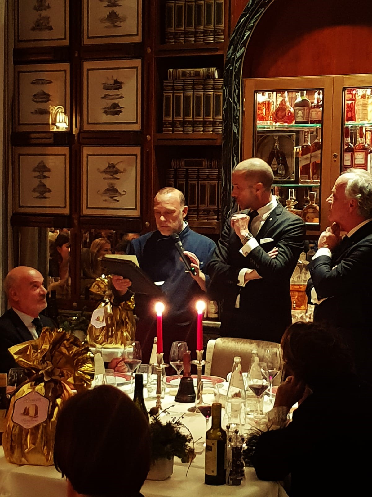 La Delegazione dell'Alto Vicentino si è riunita, in occasione della riunione conviviale degli auguri, presso il ristorante "Da Riccardo" a Carrè. Foto 1: il Delegato Renzo Rizzi consegna il Premio "Dino Villani" a Giancarlo Maistrello e alla sorella Marta. Foto 2: il Delegato e il Simposiarca con lo staff del locale. Foto 3: catalana di code di scampi e gamberi. Foto 4: fetta di panettone con crema chantilly.