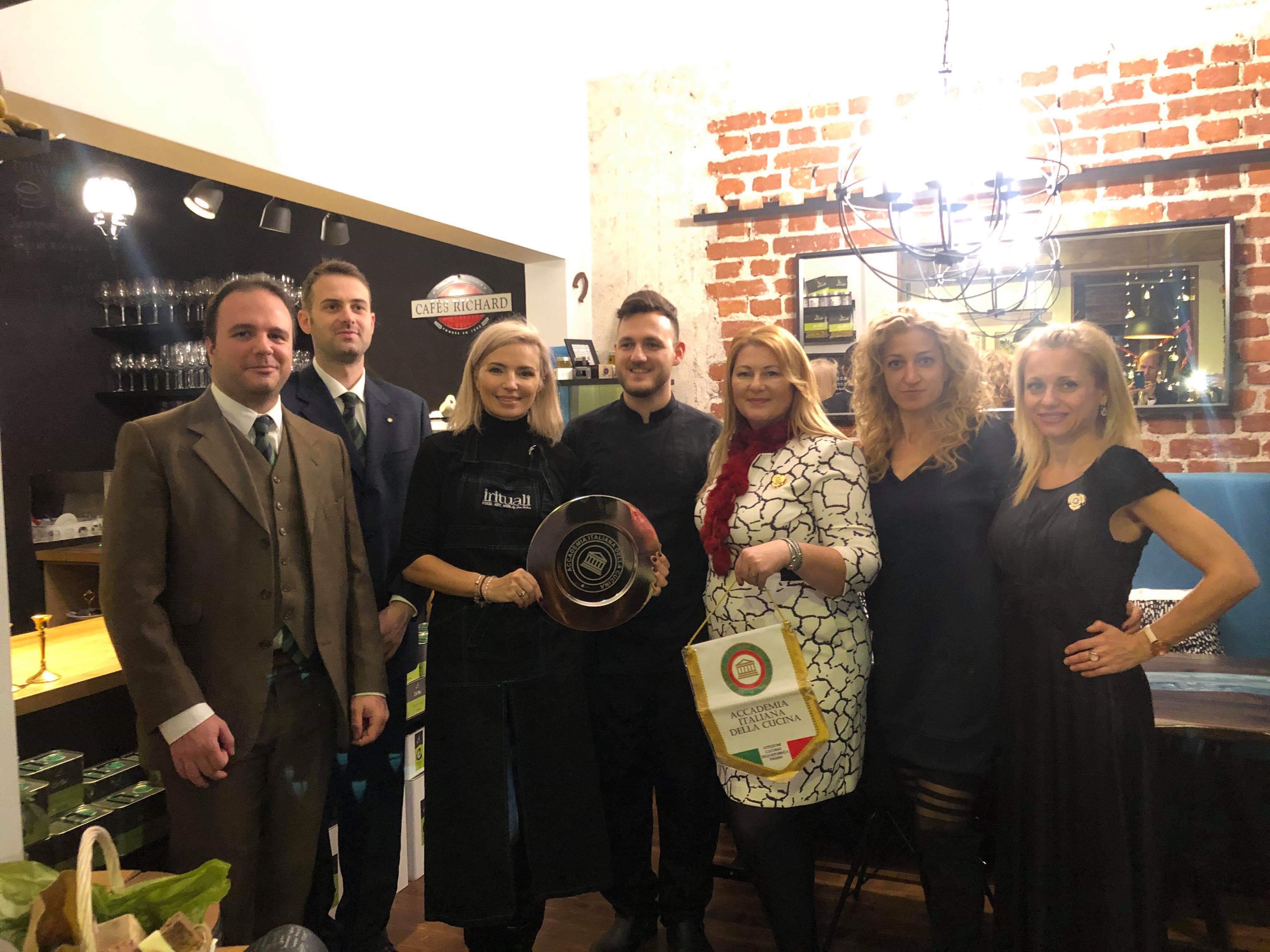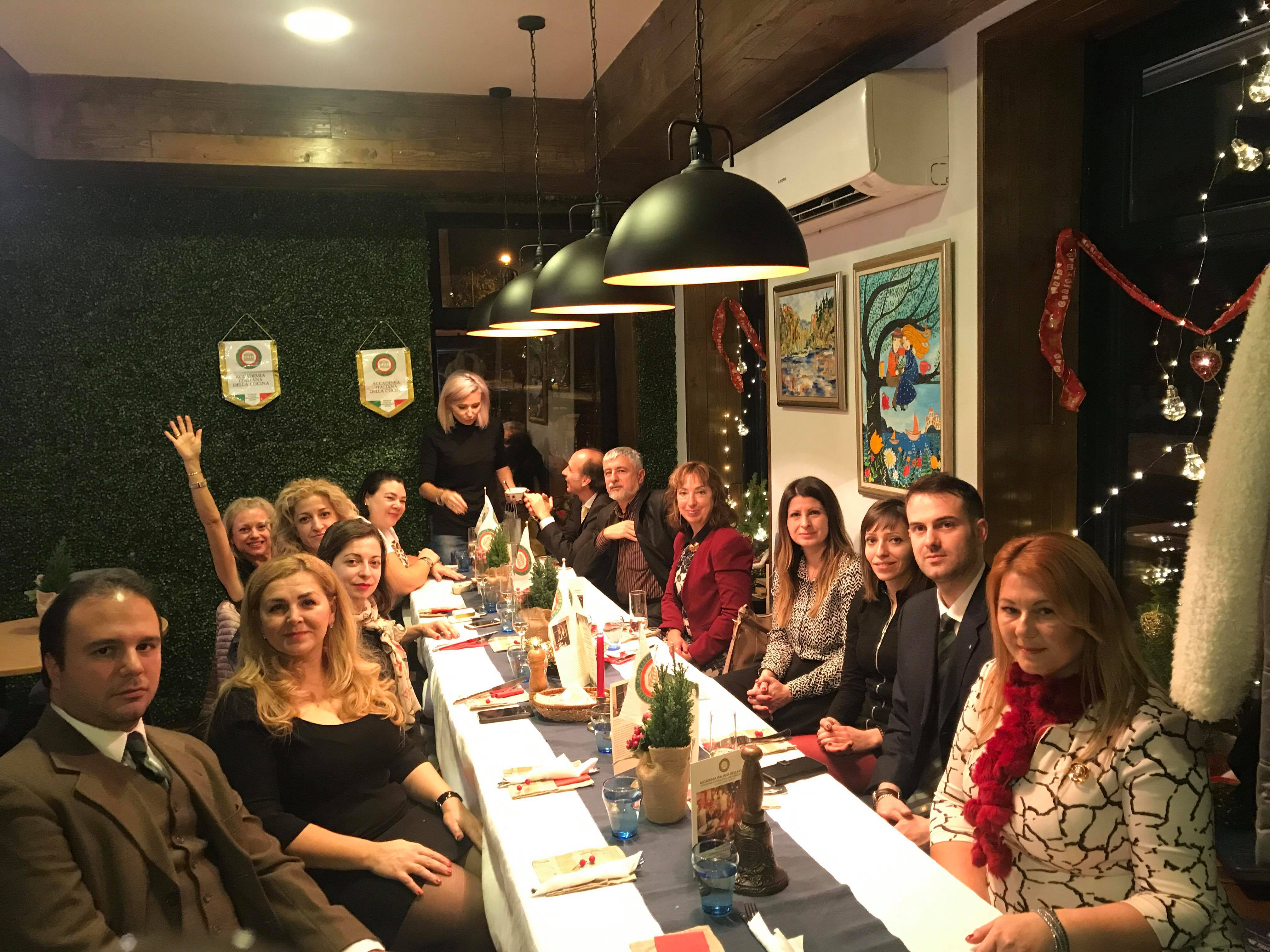 La Delegazone di Sofia, in occasione degli auguri di Natale, si è riunita presso il ristorante "Irituali". Foto 1 (da sinistra): il Consultore-Segretario Niccolò Zanotelli Simposiarca della serata, Jacopo Martino de Carles Vice Delegato, Irina Tencheva proprietaria del locale, Savas Karipoglu chef, Penka Nesheva Delegata, Velislava Nedelcheva e Vanya Tsolova Accademiche. Foto 2: la proprietaria Irina Tencheva e la Delegata Penka Nesheva. Foto 3: Accademici e ospiti. Foto 4: pangiallo romano, una ricetta tra tradizione e innovazione.