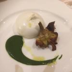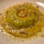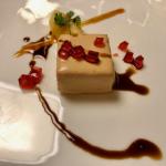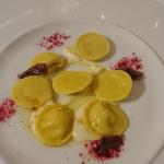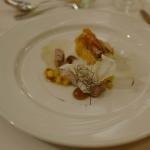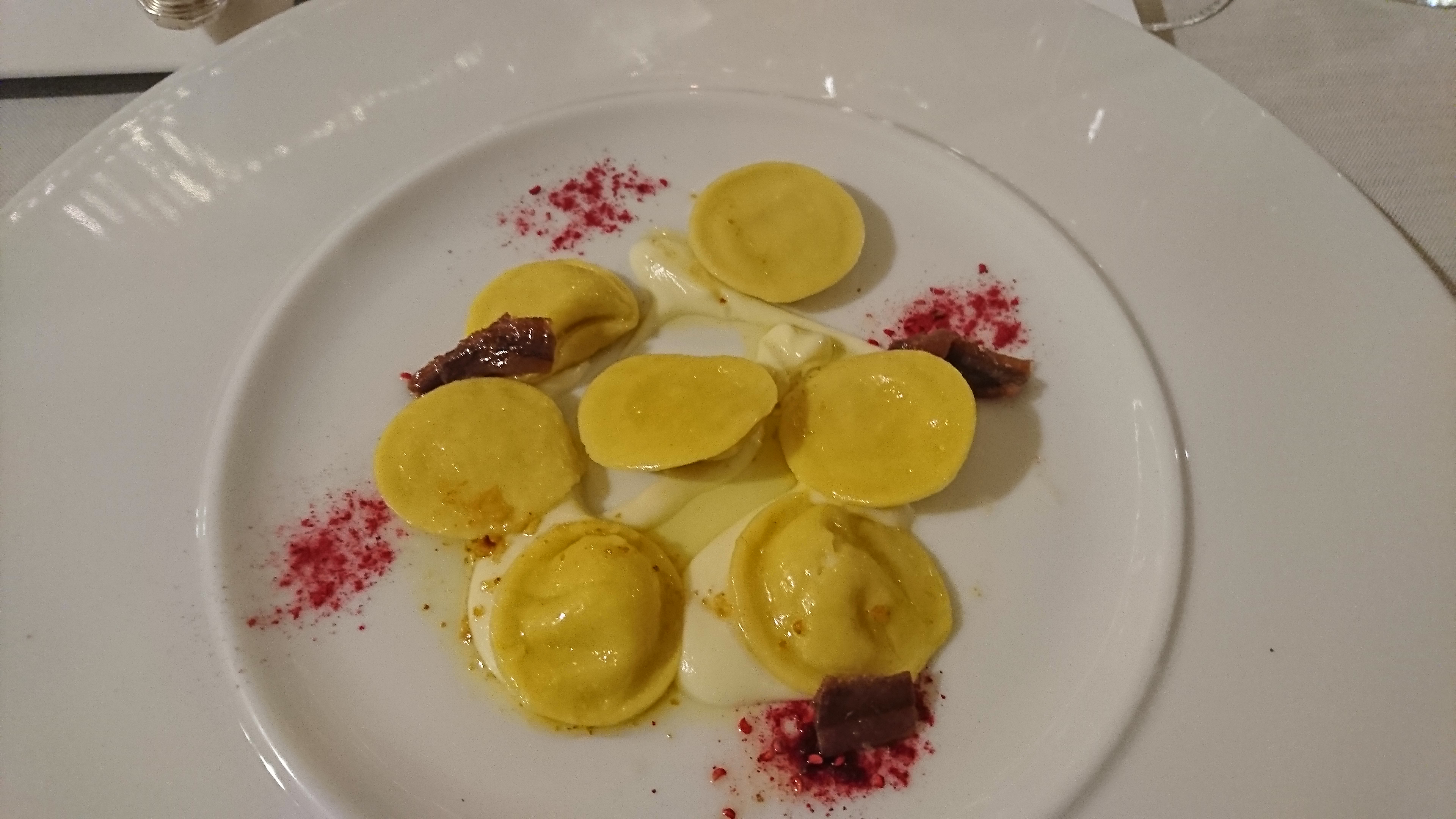 La Delegazione di Imola si è riunita presso il ristorante "San Domenico", Magnifico del Presidente, in occasione della riunione conviviale degli auguri. Foto 1: un momento della serata, in primo piano a destra il Vice Presidente dell'Accademia Severino Sani e alla sua sinistra il Delegato di Imola Antonio Gaddoni. Foto 2: il pluaso finale alla brigata di cucina guidata dagli chef Valentino Mercattilii e Massimiliano Mascia. Foto 3: millefoglie di fagiano e fegato d'oca con purea di mele golden e gelatina al Porto. Foto 4: uovo in raviolo "San Domenico" con burro di malga, parmigiano dolce e tartufo di stagione.