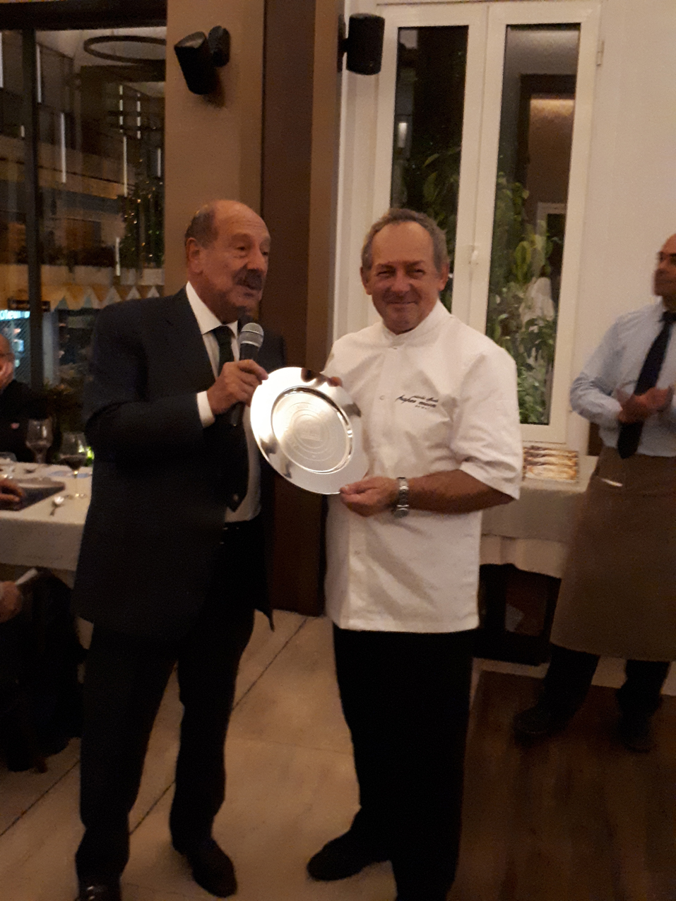 Per la Delegazione di Beirut la cena in occasione della II Settimana della Cucina Italiana nel mondo si è svolta presso il ristorante "Paper Moon". Foto 1: il Delegato Mario Haddad offre il piatto in silver dell'Accademia allo chef del ristorante, Nicola Offredi. Foto 2: un momento della serata. Foto 3: un piatto creato dallo chef per l'occasione.