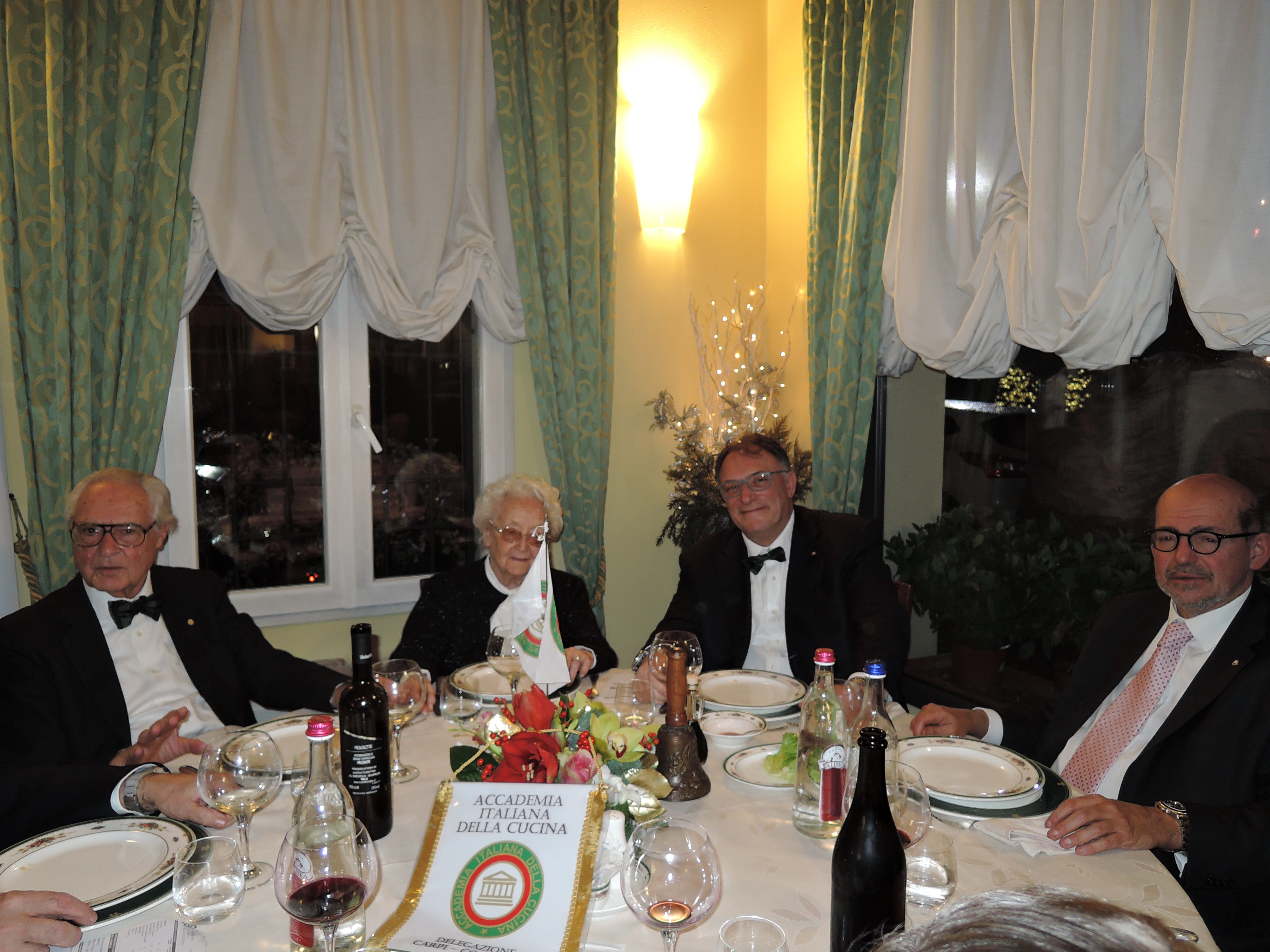 Cena degli Auguri per la Delegazione di Carpi Correggio. Foto 1: da sinistra: il Presidente Onorario Giovanni Ballarini con accanto la moglie, il Delegato Pier Paolo Veroni, il neo Delegato di Bologna Luca Atos Cavazza. Foto 2 e 3: momenti della serata. Foto 4 e 5: Pier Paolo Veroni, Delegato di Carpi Corregio insieme ad alcuni ospiti della serata. Foto 6: Pier Paolo Veroni con il Presidente Onorario Giovanni Ballarini.