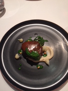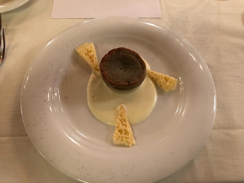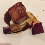La cena degli auguri di Natale, per la Delegazione di Biella, si è svolta presso il ristorante "Il Patio". Foto 1: Accademici riuniti a tavola. Foto 2: cappellacci di gallo alla cacciatora con il suo brodo ristretto. Foto 3: spalletta di vitello extra cotta con crema di castagne, salsa al nebbiolo e melograno.