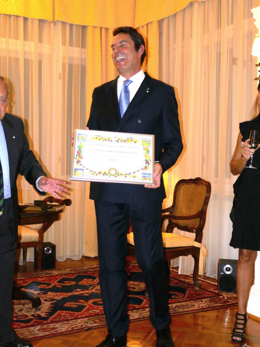 Dopo la pausa estiva la Delegazione di Budapest si è ritrovata per una riunione conviviale-ricevimento nell'insolita cornice della residenza di S.E. l’Ambasciatore d’Italia a Budapest Massimo Rustico che, con la consorte Monika, ha ospitato un folto gruppo di Accademici. Foto 1: il Consigliere di Presidenza, Sergio Corbino, consegna l'attestato di Accademico Onorario a S.E Massimo Rustico. Foto 2: consegna attestato. Foto 3: Massimo Rustico.