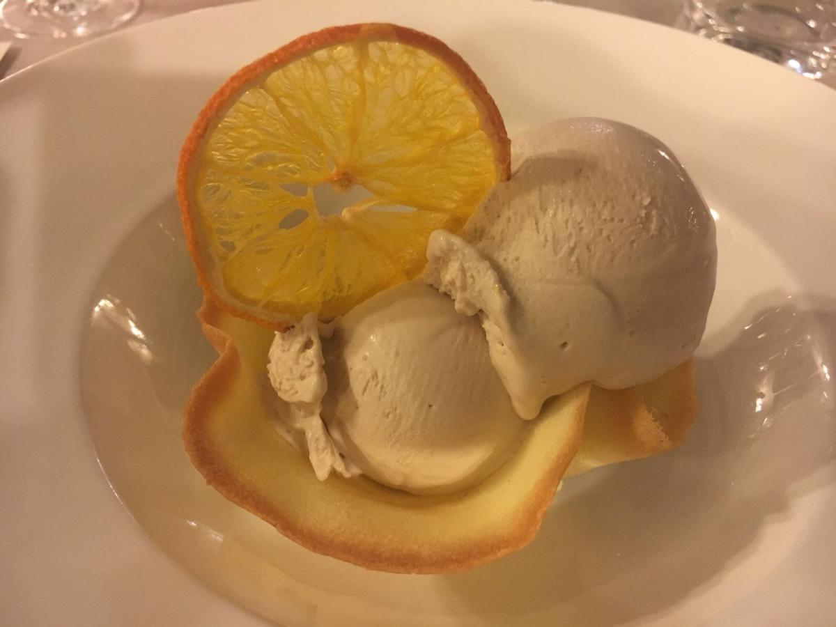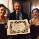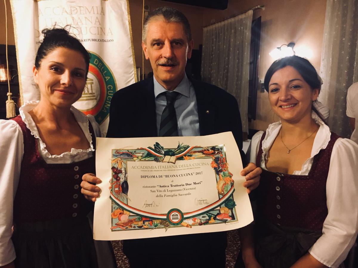 Riunione conviviale tenuta dalla Delegazione in occasione della consegna del Diploma di Buona Cucina 2017 all'Antica Trattoria Due Mori di San Vito di Leguzzano (VI).Foto 1:da destra i Simposiarchi Carlo Perini, Massimo Carboniero e il Delegato Renzo Rizzi con Cristina e Margherita in primo piano (figlie di Rosalia Saccardo titolare del locale). Foto 2: il Delegato consegna il Diploma di Buona Cucina 2017 alle figlie della titolare della trattoria Rosalia Saccardo. Foto 3 e 4: Accademici a tavola. Foto 5: risotto ai finferli e morlacco. Foto 6: mantecato alla nocciola.