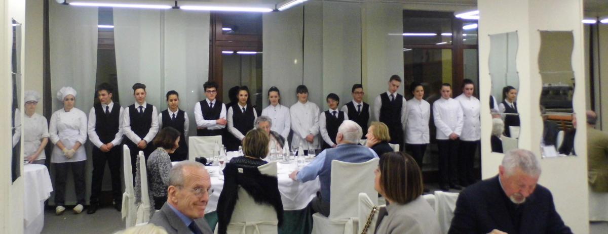 Convivio di marzo della Delegazione di Biella presso l'Istituto Alberghiero “Ermenegildo Zegna” di Cavaglià. L'evento culturale, proposto dalla Delegata Marialuisa Bertotto, ha approfondito il tema dell'alimentazione degli astronauti; relatore della conferenza, il Delegato di Alessandria, Luigi Bussolino, ingegnere aerospaziale. Foto 1: gli allievi dell'Istituto Alberghiero che hanno curato l'aspetto eno-gastronomico della serata. Foto 2: il menu a base di prodotti del territorio in onore del relatore alessandrino. Foto 3: le decorazioni dei tavoli. Foto 4: la Delegata di Biella Marialuisa Bertotto e il Delegato di Alessandria Luigi Bussolino.