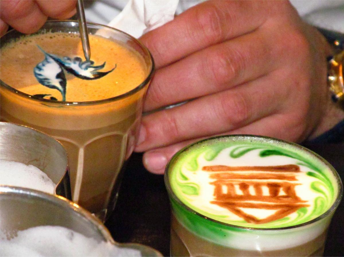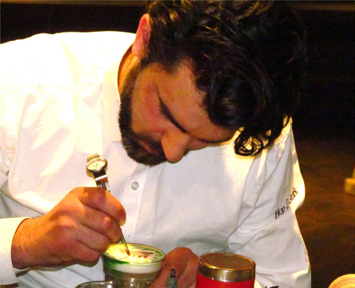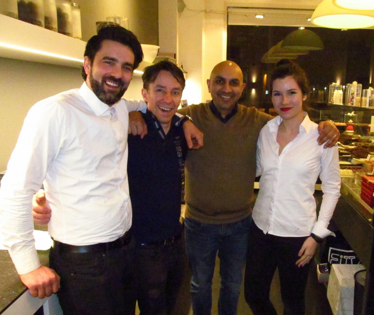 In occasione di San Valentino, la Delegazione di Den Haag - Scheveningen si è riunita presso la chocolaterie "Hop & Stork" di Den Haag per una cena a tema. Foto 1: il dolce "Death by Chocolate"; foto 2: la squadra della chocolaterie; foto 3: il Vice Delegato Stefano Angelucci ed Accademici durante la relazione sulla cioccolata; foto 4: la colorazione del cappuccino; foto 5: il barista della chocolaterie all'opera.