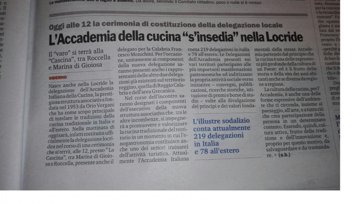 Passaggio di campana nella splendida location "la Cascina" tra Marina di Gioiosa e Roccella. Foto 1: il coordinatore appone il distintivo al neo Delegato Sandro Borruto. Foto 2: in ordine da sinistra: Dottor Antonio Monorchio, Delegato di Area Grecanica-Terra del Bergamotto, al centro: Dottor Sandro Borruto, nuovo Delegato di Locride-Costa dei Gelsomini e il Dottor Francesco Menichini, Delegato di Cosenza. Foto 3: il Delegato Antonio Monorchio offre la campana al Delegato Sandro Borruto. Foto 4: in ordine da sinistra: Dottor Francesco Menichini, Dottor Antonio Monorchio, Giuseppe Certomà (sindaco del comune di Roccella Jonica) e infine il neo Delegato Sandro Borruto. Foto 5: piatto presentato per l'occasione. Foto 6: articolo che descrive l'evento.