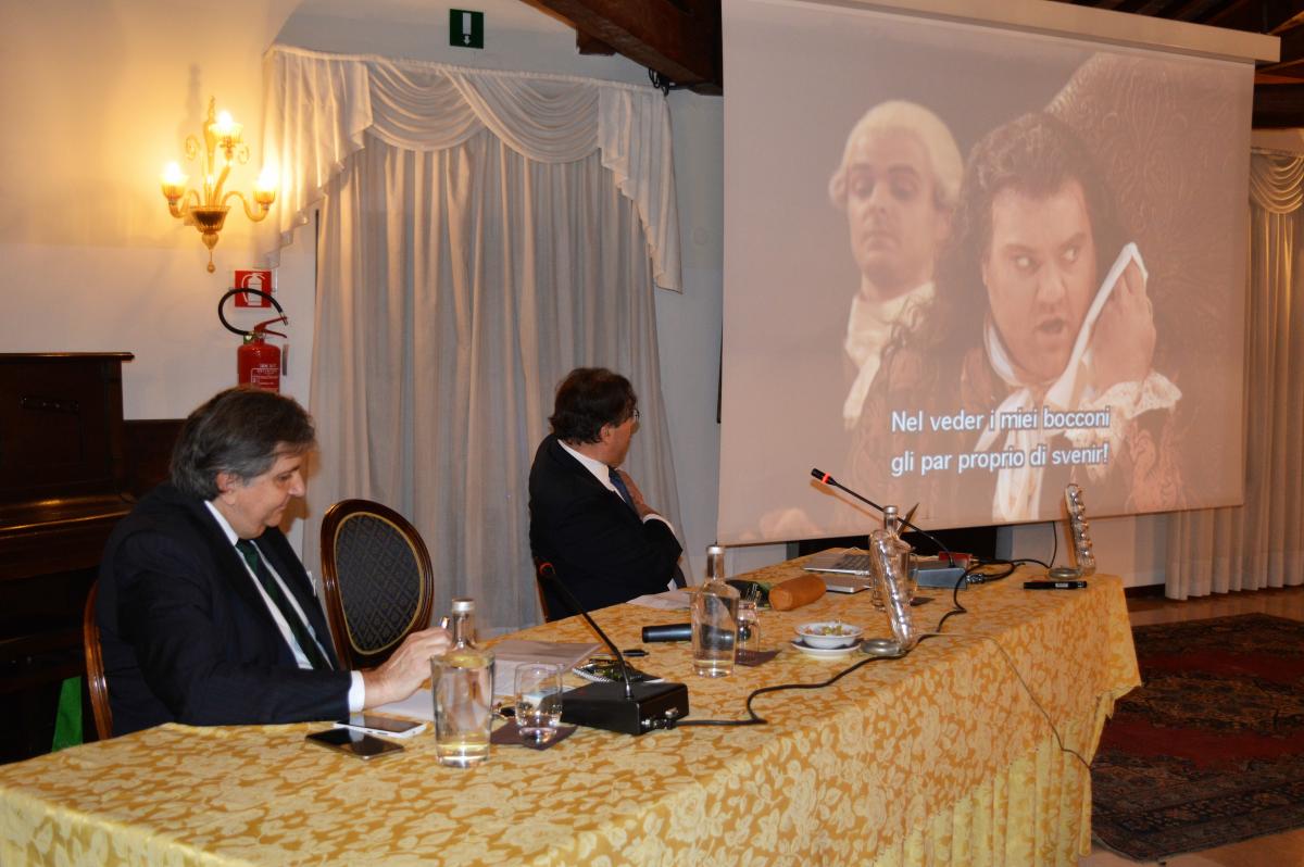 Proseguendo un’iniziativa che collega il mondo del cibo e della ristorazione alle varie forme di arte, avviata nel settembre 2016 con una riunione conviviale dedicata a “Cibo e Cinema”, la Delegazione di Venezia Mestre ha organizzato sabato 11 marzo 2017 a Villa Braida a Mogliano Veneto un evento dedicato al rapporto tra la musica e la gastronomia intitolato “Musica in Cucina”. Foto 1. L'apertura della relazione del prof. Luca Zoppelli, ordinario di Musicologia presso l’Università di Friburgo in Svizzera, dal tema “Il banchetto all’opera”. Foto 2. Una scena del "Don Giovanni" di Mozart. Foto 3. L'apertura della riunione conviviale. Foto 4. Il tavolo del Delegato Franco Zorzet. Foto 5. Il Maestro Stefano Caprioli accompagna la cantante Victoria Lyamina. Foto 6. I complimenti del Delegato allo chef e alla brigata di cucina.