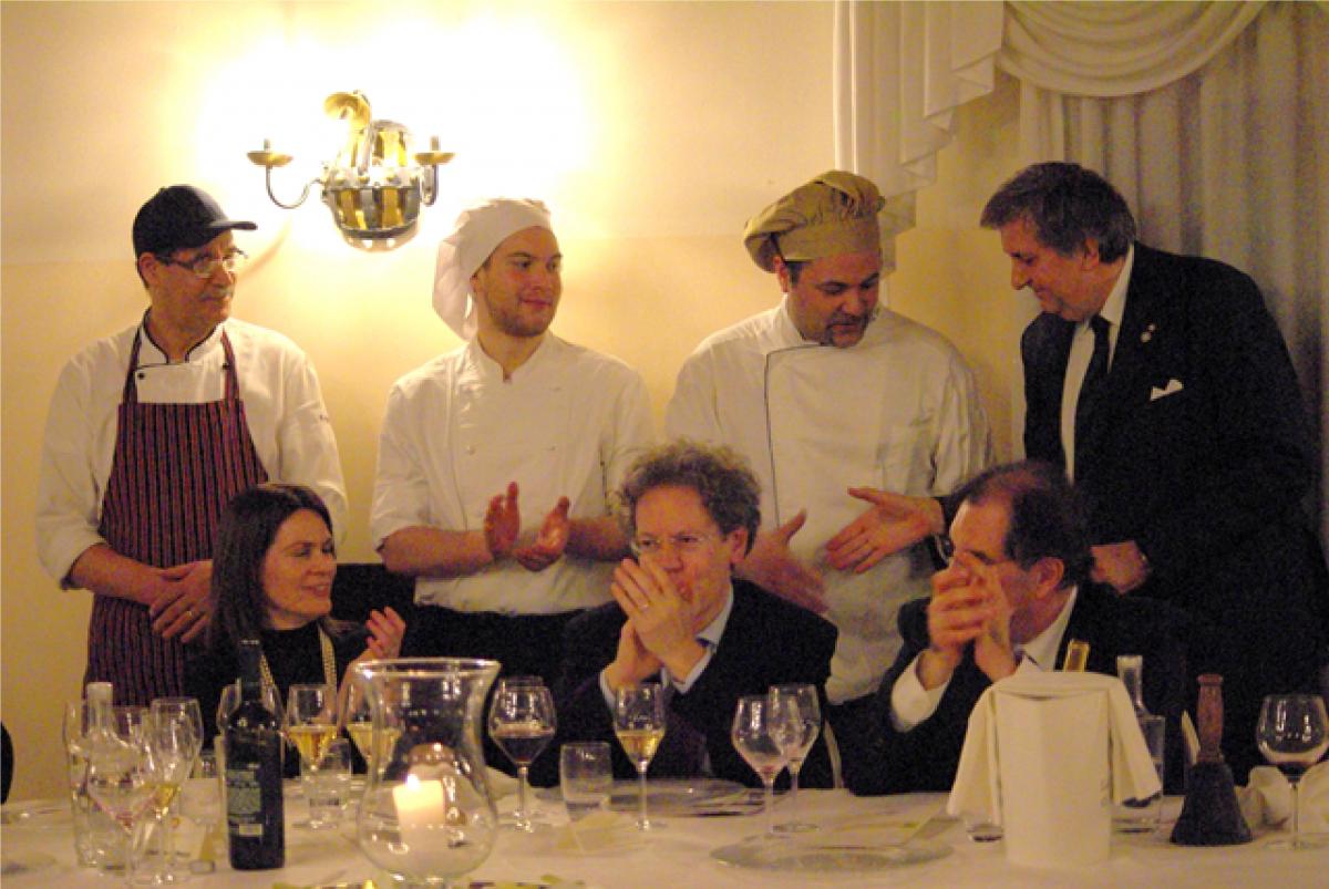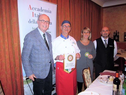 Foto 1: da sinistra Michele Sansone, contitolare del ristorante, la Delegata Maryann Palm, Michele Sansone altro contitolare, i due cuochi e il Simposiarca Vincenzo Pennetta. Foto 2: un momento della serata tra gli Accademici.