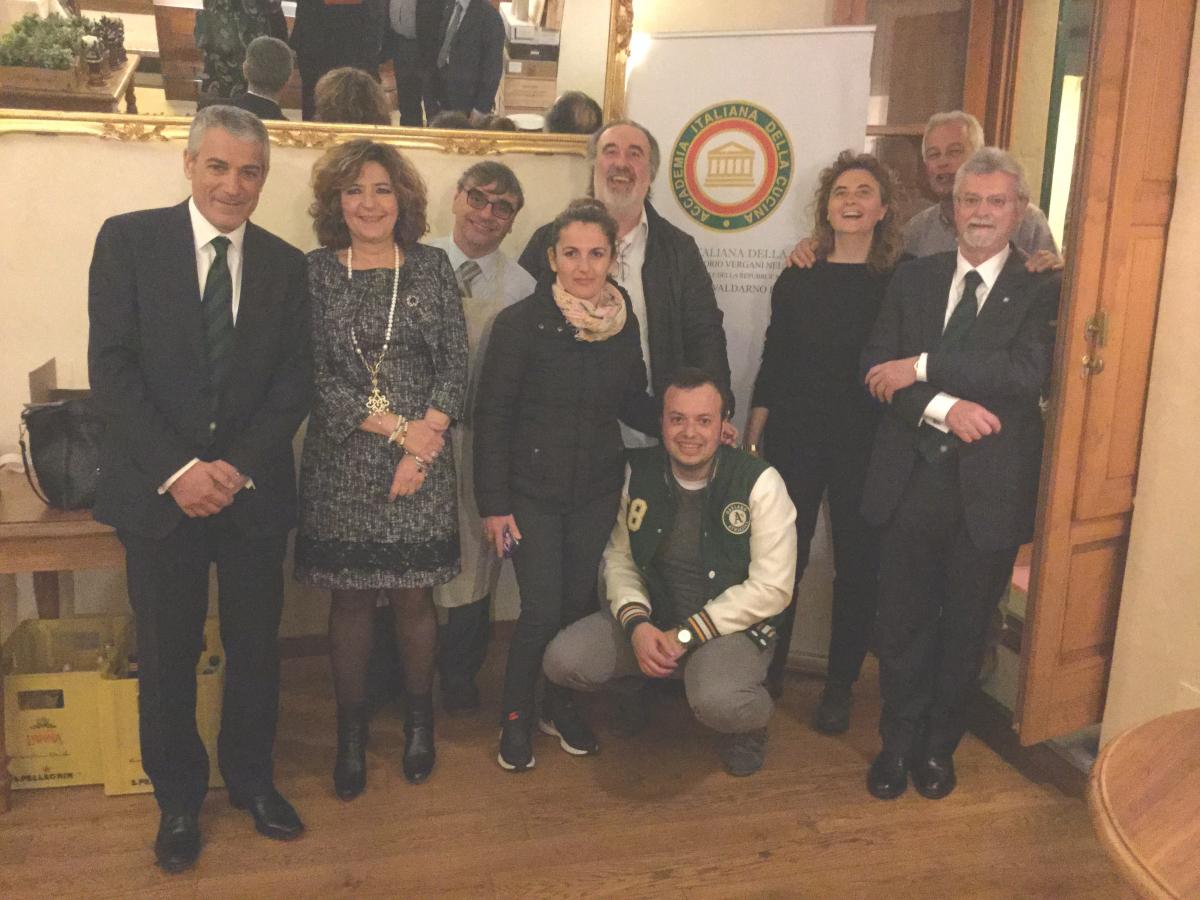 La Delegazione del Valdarno Fiorentino ha organizzato nel mese della cultura due riunioni conviviali dedicate alla conoscenza e degustazione di oli toscani e sardi. La serata del 17 marzo si è svolta presso il ristorante "Terrazza, Oliosteria" di Greve in Chianti; nell’occasione erano presenti due Delegati della Sardegna. Nella foto da sinistra: il Delegato di Sassari Silki Antonio Fraghì, la Delegata di Nuoro e CT Sardegna Gabriella Guiso, la Brigata di cucina con lo chef Stefano Bertini (in piedi accanto al roll up), i gestori del locale Lara e Giampaolo, il Delegato del Valdarno Fiorentino Ruggero Larco.