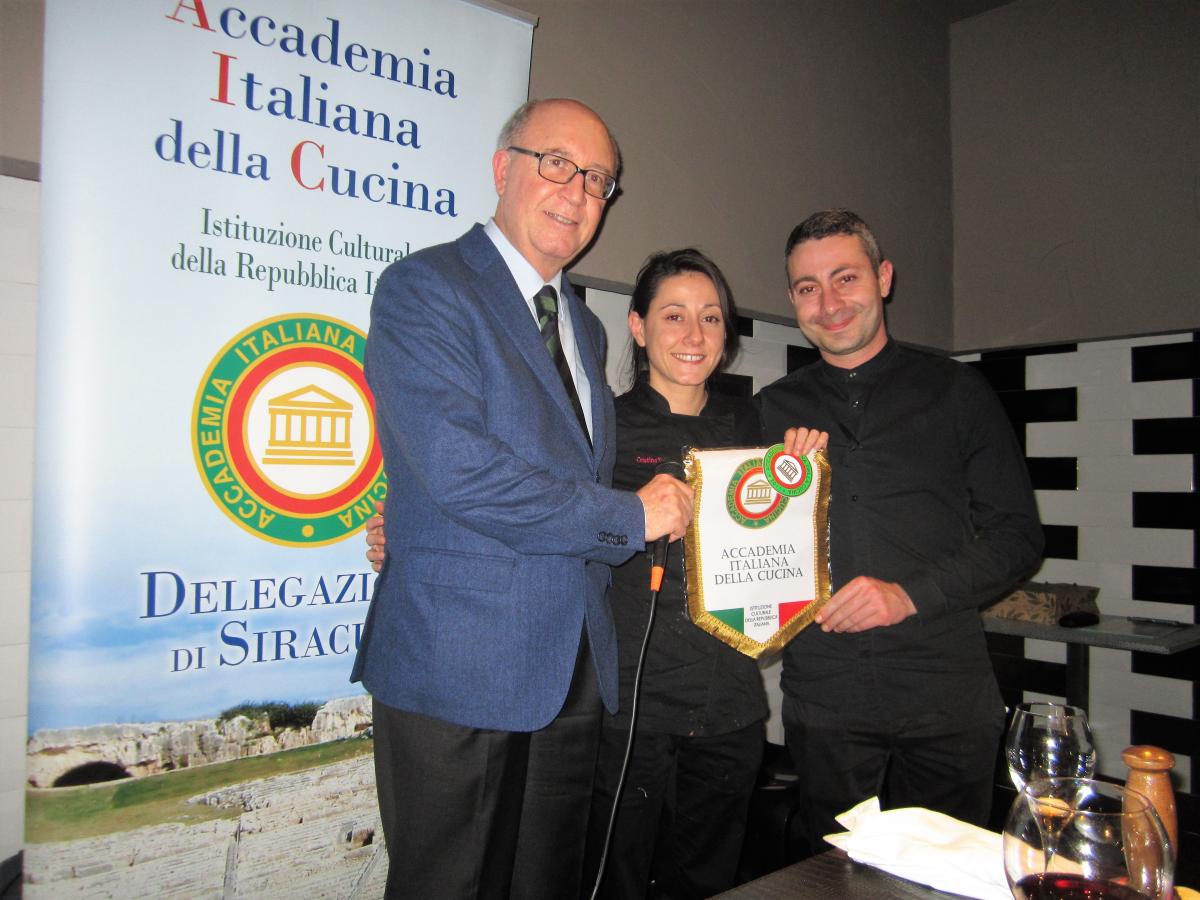 La Delegazione di Siracusa ha visitato il Ristorante Akademia dell’Hotel One di Siracusa per il primo Simposio del 2017 . Foto 1. Rosalia Sorce, Vice Delegata, e Angelo Tamburini, Delegato, che ha relazionato su "Le Curiose parole della Cucina". Foto 2. Gli Accademici di Siracusa. Foto 3. La consegna del guidoncino accademico e della vetrofania 2017 alla chef Cristina Veneziano e al maître Alessandro Giudice. Foto 4. Tortino di cavolfiori e alici.