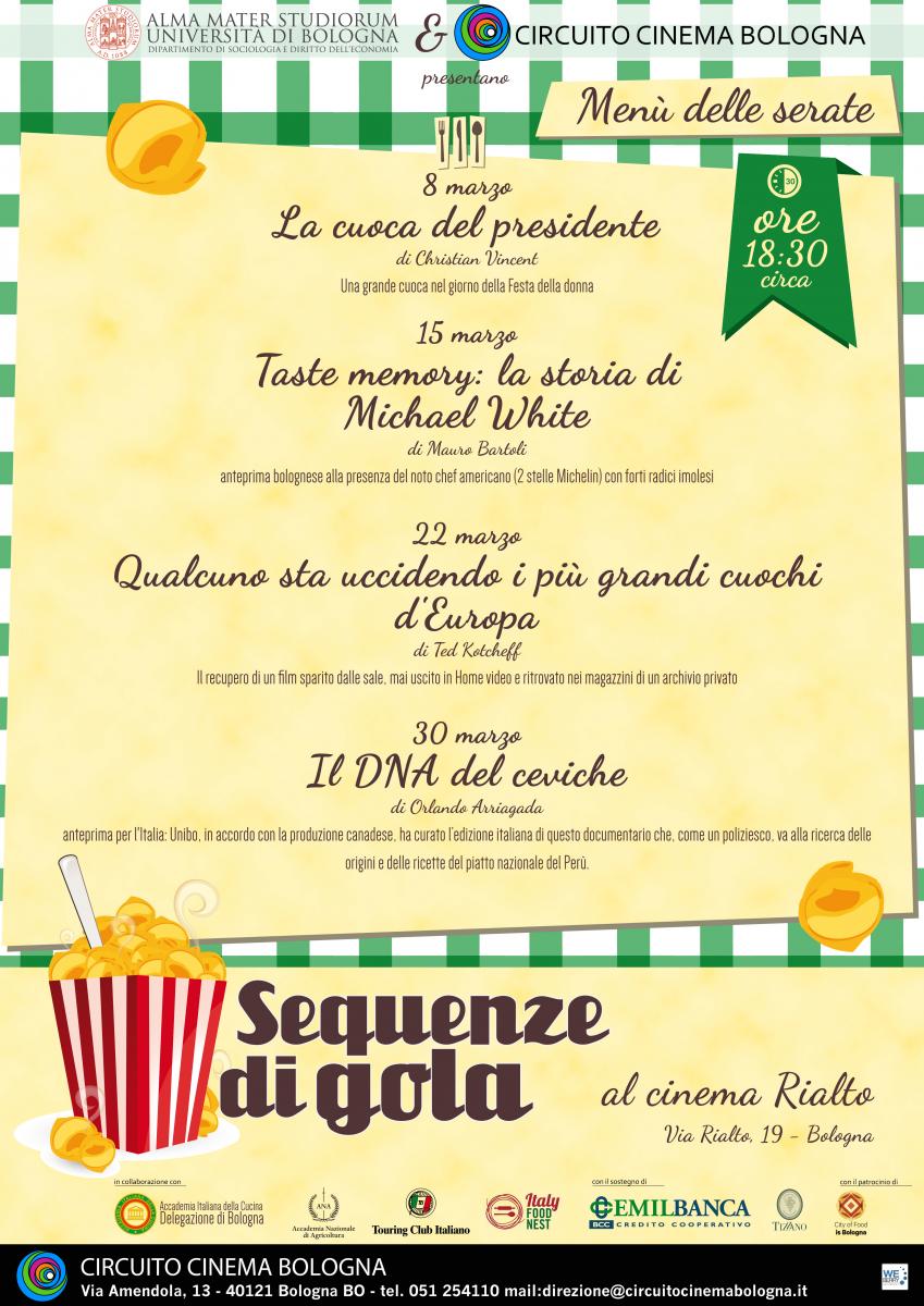 Anche quest'anno la Delegazione di Bologna partecipa alla manifestazione "Sequenze di gola", una rassegna cinematografica sul rapporto tra cinema e cibo, promossa dal Dipartimento di Sociologia e Diritto per l’Economia e dal Circuito Cinema di Bologna.