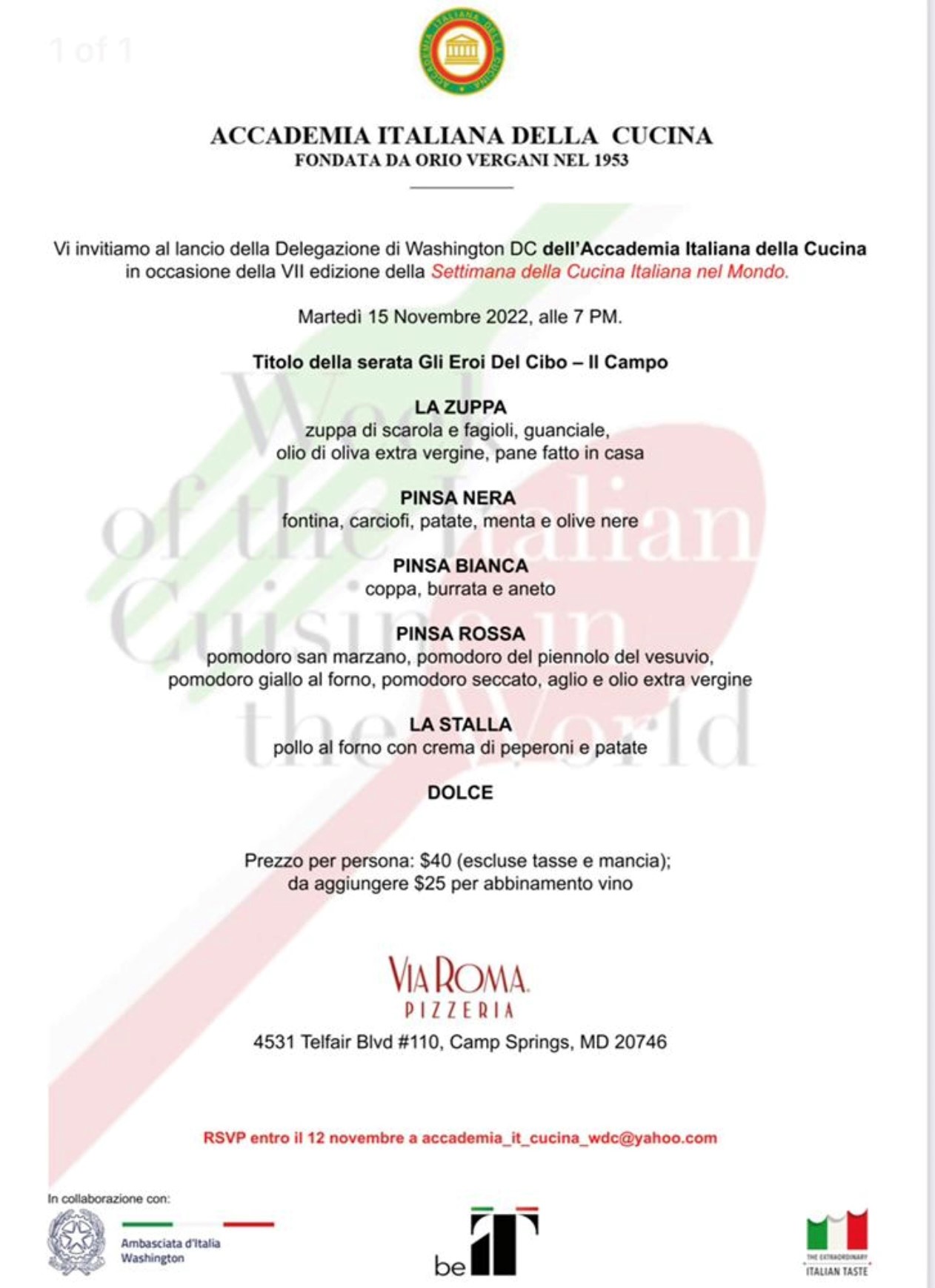 Evento di lancio della neo costituita Legazione dell'Accademia Italiana della Cucina in collaborazione con Ambasciata d'Italia a Washington. In questa occasione si terrà una cena sul tema "Gli Eroi del Cibo - Il Campo".